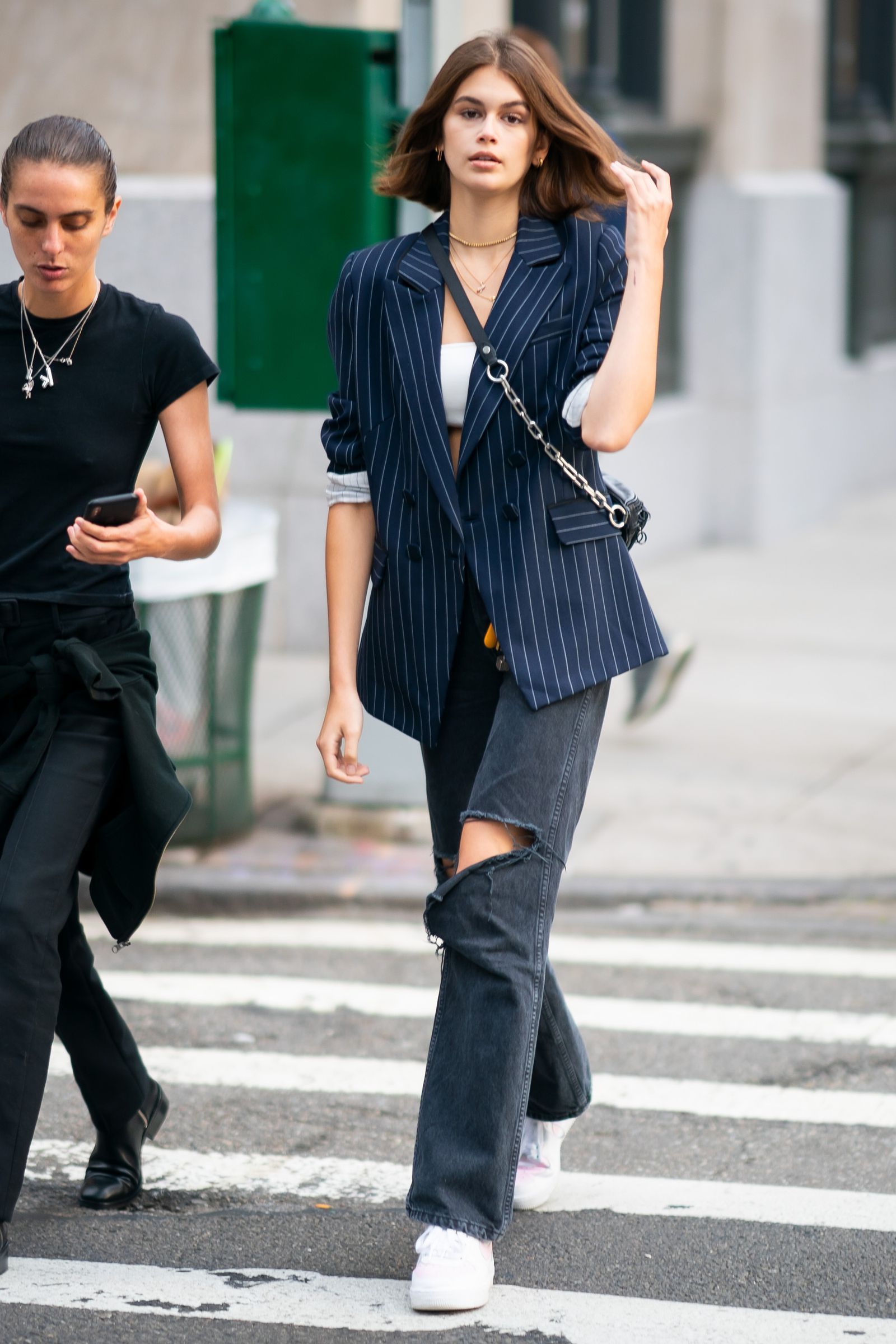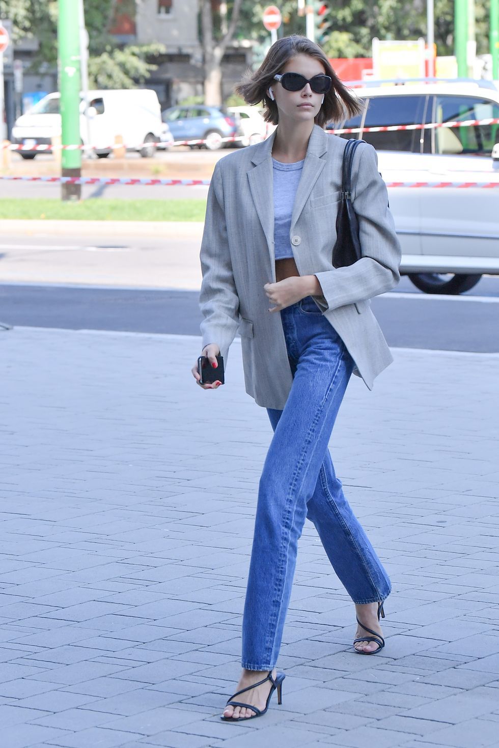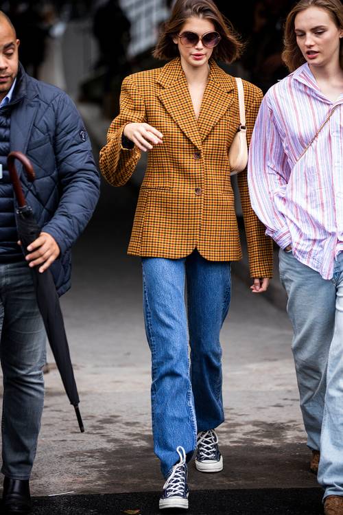 Kaia Gerber jean konusunda pek çok model ve renge şans veriyor. Siyah jean, yüksek bel mom jean, boru paçalı jeanler… Tüm bu jean modellerini kombinlerken üzerinde en sık rastladığımız parça ise blazer ceketler.