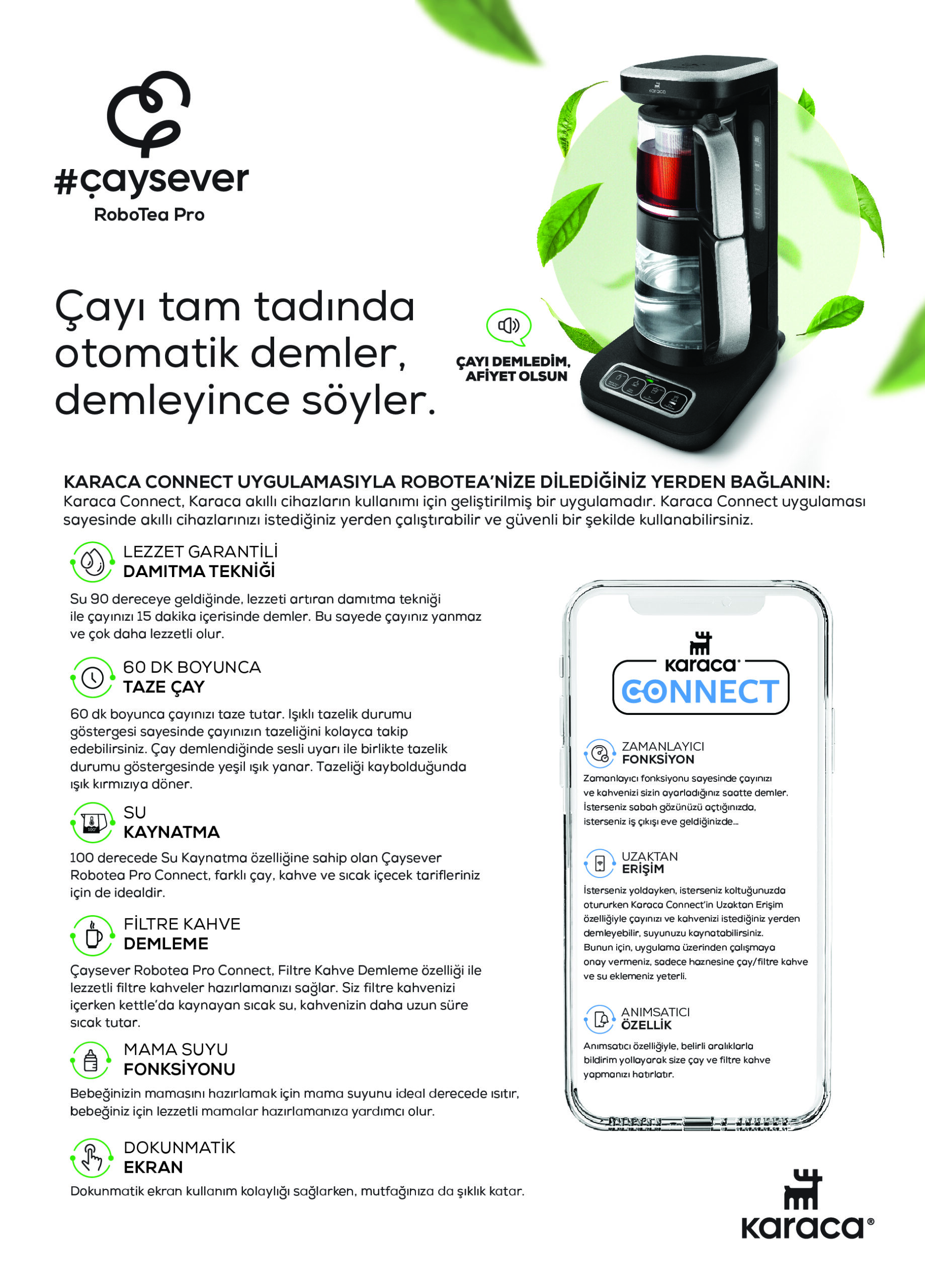 Yenilikçi ürünleriyle mutfaklarımızda fark yaratan ve yaşamımızı kolaylaştıran Karaca, bu sefer de Çaysever RoboTea Pro ile zamandan tasarruf etmemizi sağlıyor. Karaca Connect uygulamasından uzaktan erişimle yönetilebilen bu cihaz sayesinde hem sabah kahvemiz tek tıkla demleniyor hem de spontane etkinliklede çayın demlenmesi sadece 15 dakikamızı alıyor. Çayı kendi kendine demleyen ve demlenme aşamalarını konuşma özelliğiyle bizlere bildiren Çaysever RoboTea Pro; lezzet garantili damıtma teknolojisiyle çay yapraklarının yanmasının da önüne geçiyor. Bize sadece lezzetli çay içmenin keyfini sürmek kalıyor.
