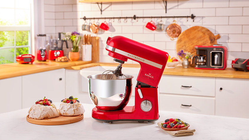 Karaca, küçük ev aletlerinde daima sürdürdüğü yenilikçi anlayışı yeni Mastermaid Chef Stand Mikser ile taçlandırarak iddiasını sürdürüyor. Hamur yoğurma kancası, balon çırpıcı, düz karıştırıcı olmak üzere 3 farklı aparatı bulunan Karaca’nın yeni stand mikseri, birbirinden farklı tarifleri kısa sürede, kolayca hazırlamak için en pratik çözümü bir arada sunuyor. Güçlü motoru sayesinde benzersiz performans sunan Karaca Mastermaid Chef Stand Mikser, yüksek devir gücü sayesinde elle yapılan tarifleri, zahmetsizce en ideal kıvamda hazırlıyor. Böylece mutfakta geçirilen hazırlık süreci kısalıyor ve sofraya daha az yorgun ve sofranın keyfini çıkarmaya hazır bir ev sahibi kalıyor!