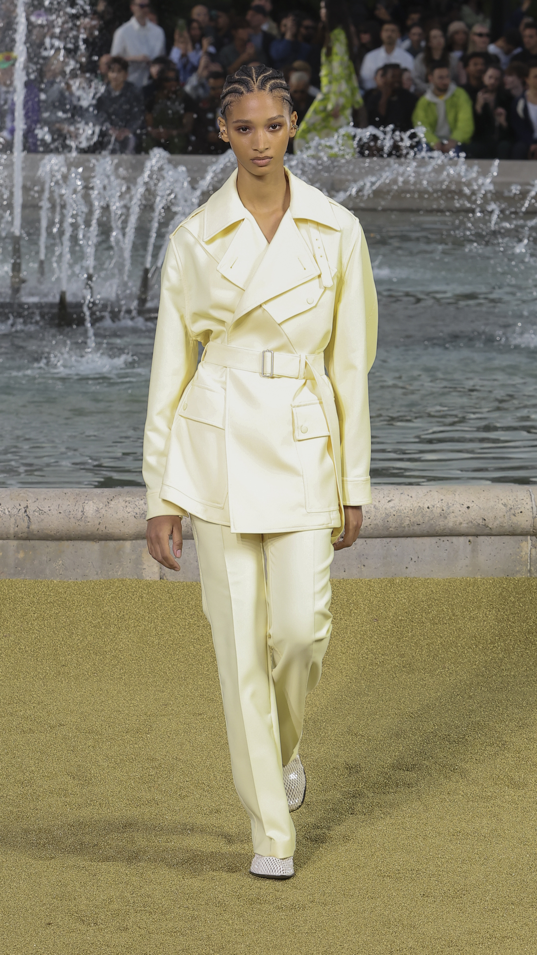 Paris Moda Haftası kapsamında Fransız kraliyet sarayı Palais-Royal’da gerçekleşen defile, dev bir ekrandan yansıyan görüntülerle izleyicilere sunuldu.