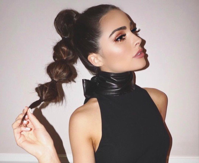 Olivia Culpo’da da görüldüğü gibi, bu tarz modern modeller, kış ayları için biçilmiş kaftan. Saçınızı tepeden topladıktan sonra, ara ara boşluklar bırakarak küçük baloncuklar yaparcasına toplamaya devam edin.