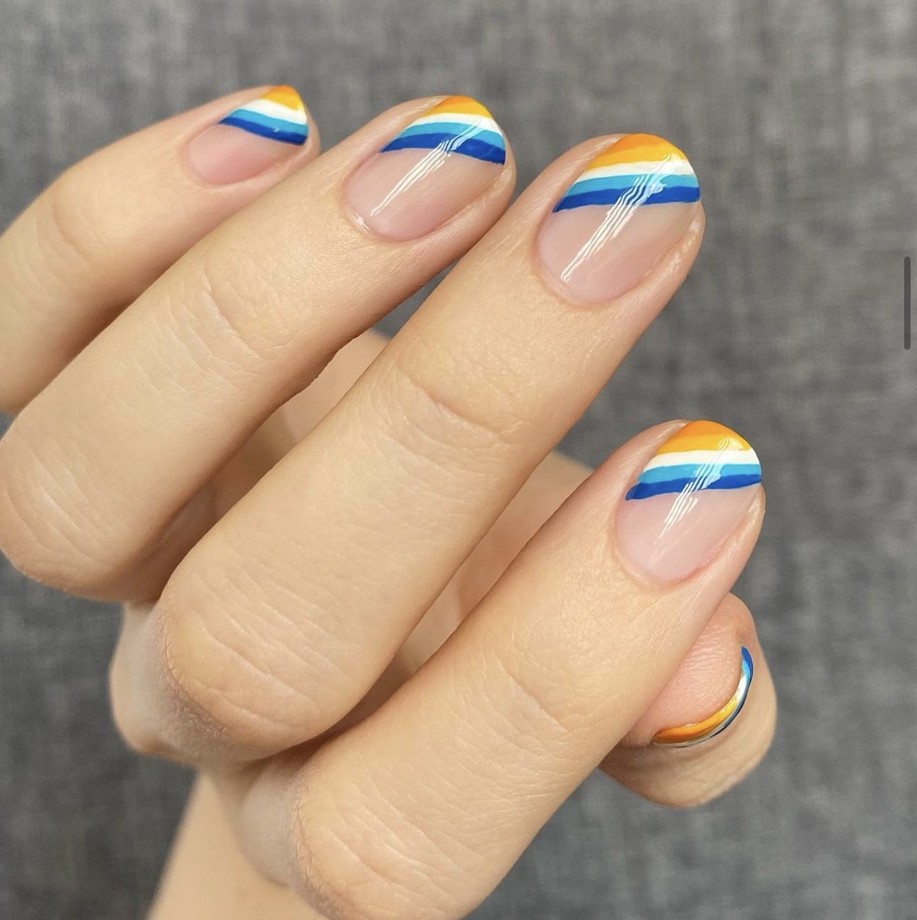 Havalar ısınırken tırnaklarınızda da yazın enerjinizi yansıtmaya ne dersiniz? Mavi ve turuncunun tonlarının bir arada olduğu bu modeli kolay çizgilerle elde edebilirsiniz.