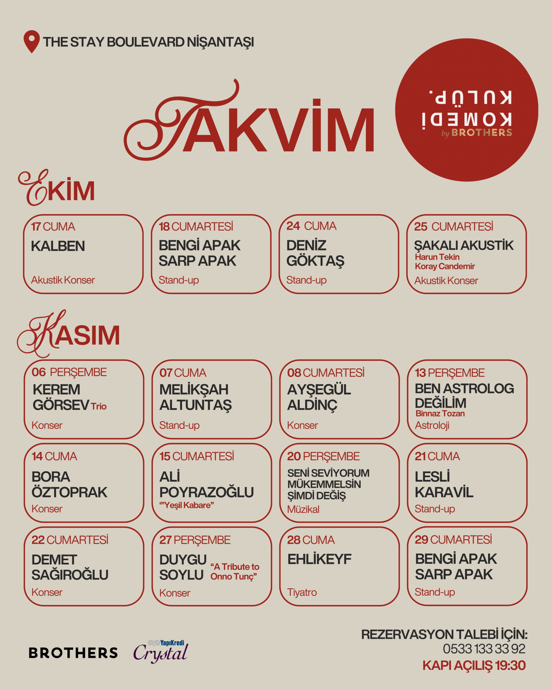 Kahkahaya doymak isteyen komedi tutkunlarına, müziğin ritmine kapılmak isteyen müzikseverlere, tiyatronun büyüsüne kapılmak isteyen sanatseverlere zengin bir program sunan Komedi Kulüp by Brothers, Nişantaşı’nın dinamik atmosferinde kültür ve sanatın buluşma noktası olmaya devam edecek.
