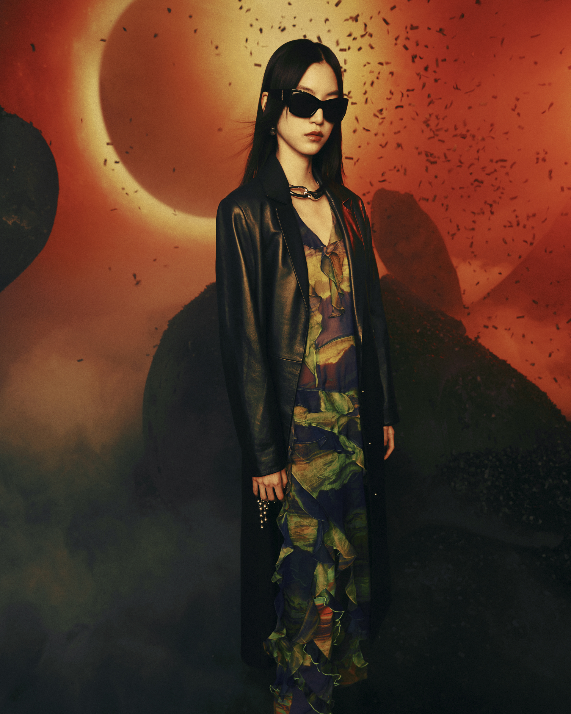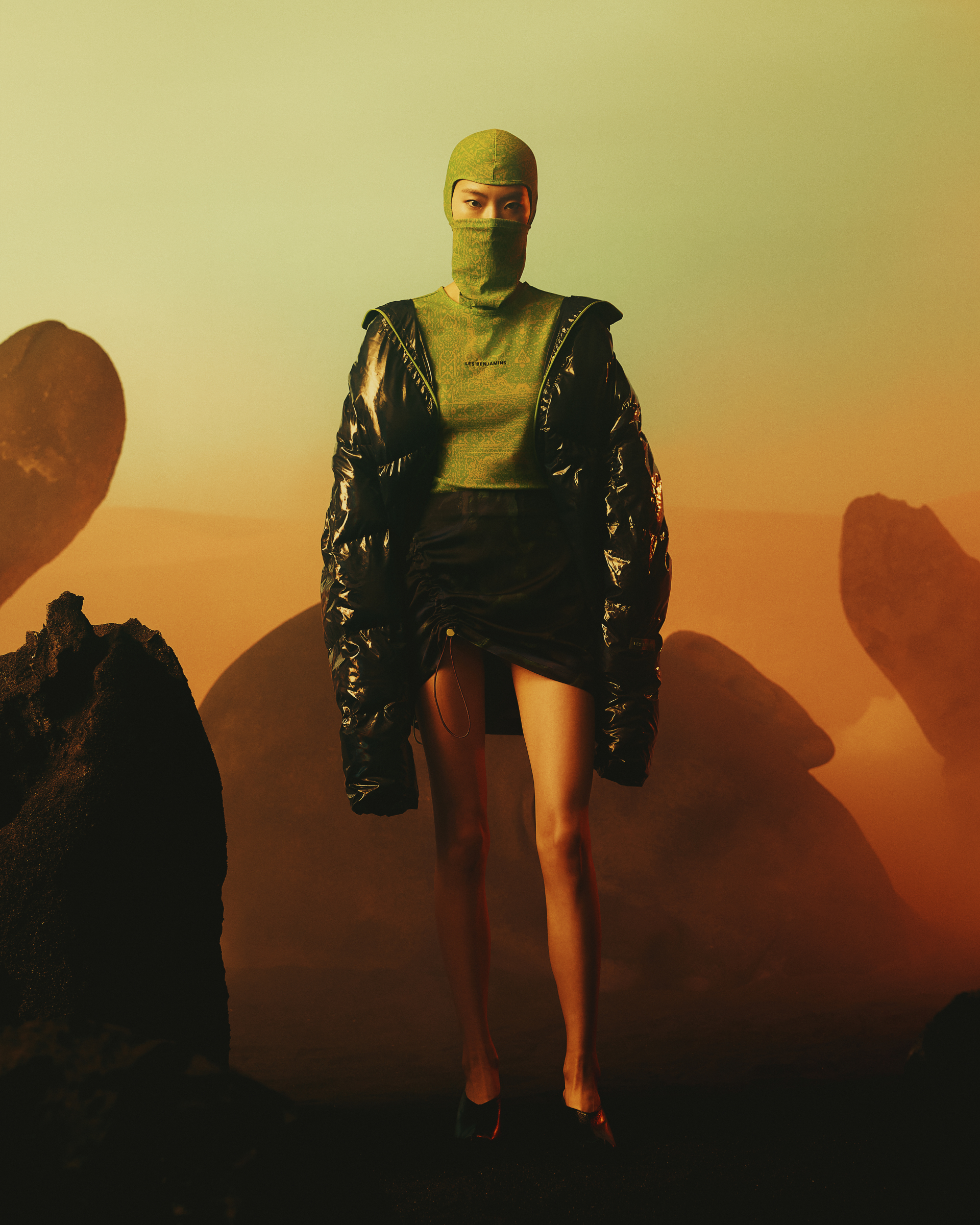 Deri, ipek ve krep kumaşların ön planda olduğu koleksiyonda tasarımlarda oyun skin’i tipi vücut zırhı, dolgu ve teknik askeri siluetlerin, her biri oversize rave tarzı patch’ler, tüpler ve büzgü gibi donanım ve işlevsel teknoloji ayrıntılarıyla bir araya getiriliyor.