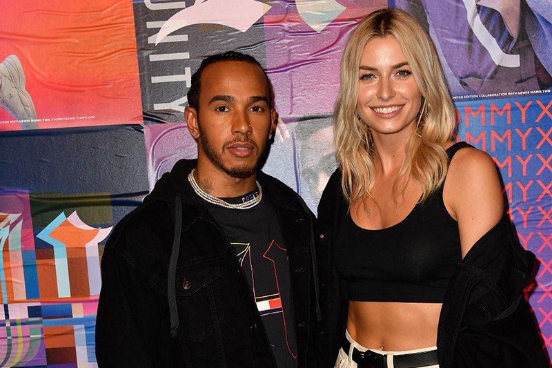 Lewis Hamilton: Tümü ?lkbahar 2019 TommyXLewis koleksiyonundan siyah ti?ört, siyah denim ceket ve beyaz, mavi ve mor renkli sneaker ayakkab?lar.