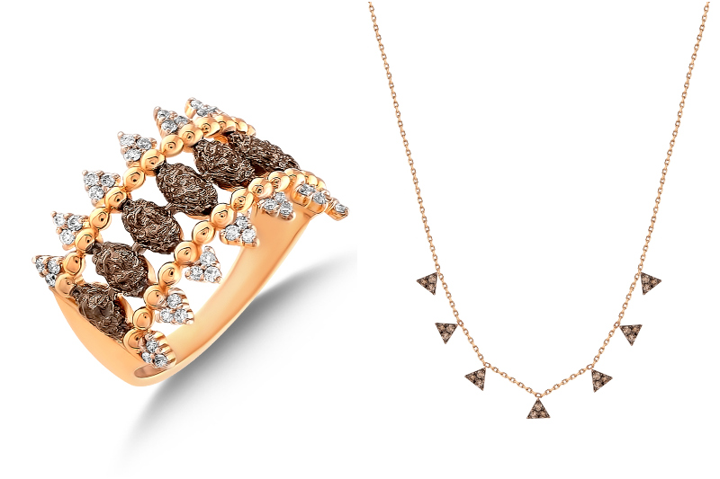 18 ayar el işçiliği ile tek tek üretilmiş olan montürler rose ve gold rengi ağırlıklı çalışıldı. Üzerine siyah, kahverengi ve bakır tonlarında rodaj teknikleri uygulanarak tasarımı ön plana çıkarmayı hedefleyen Lion Diamond’ın sonbahar koleksiyonunda; yüksek kalite şampanya ve beyaz pırlantanın farklı kesimleri kusursuz işçilikle mıhlandı.