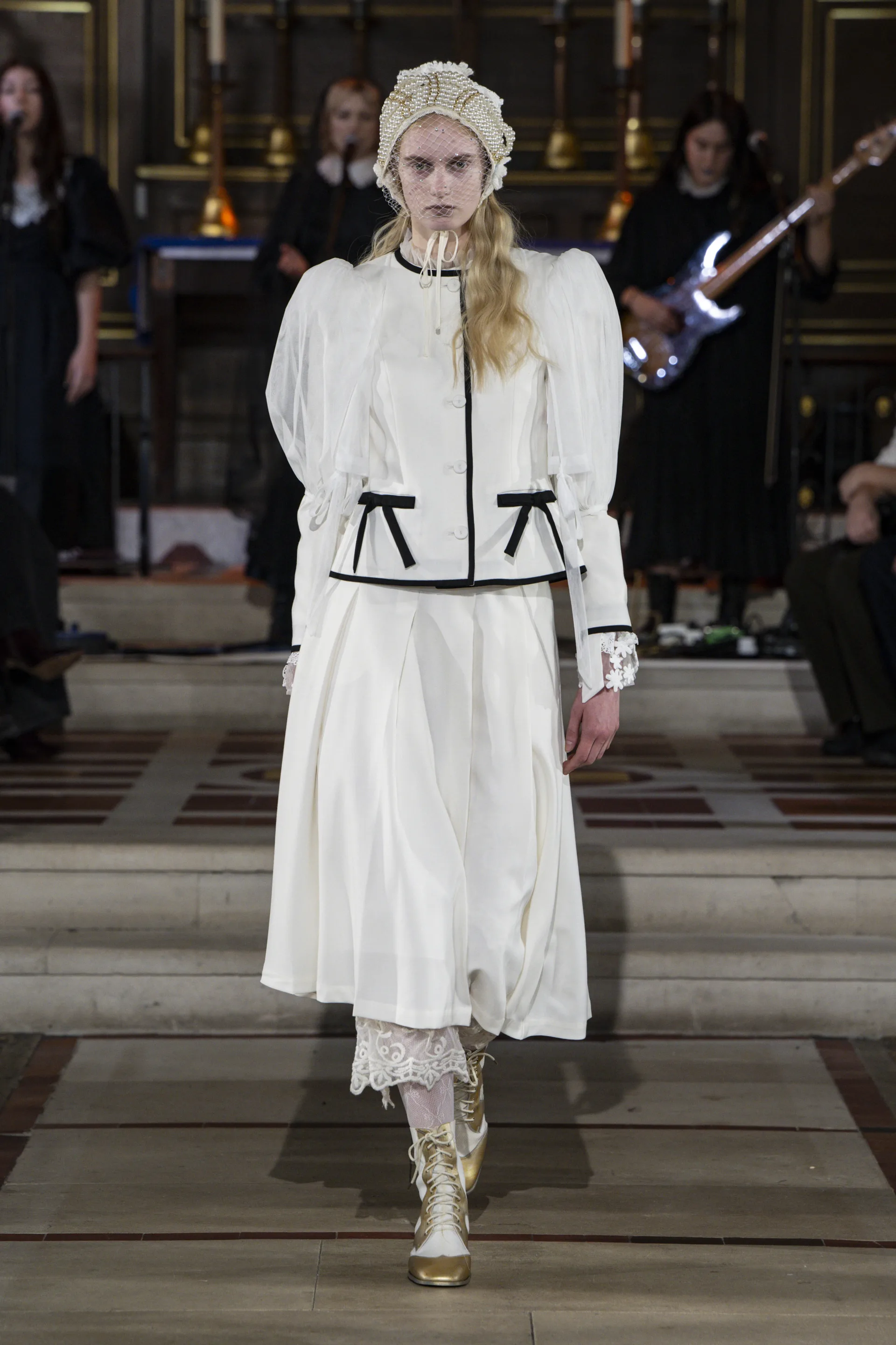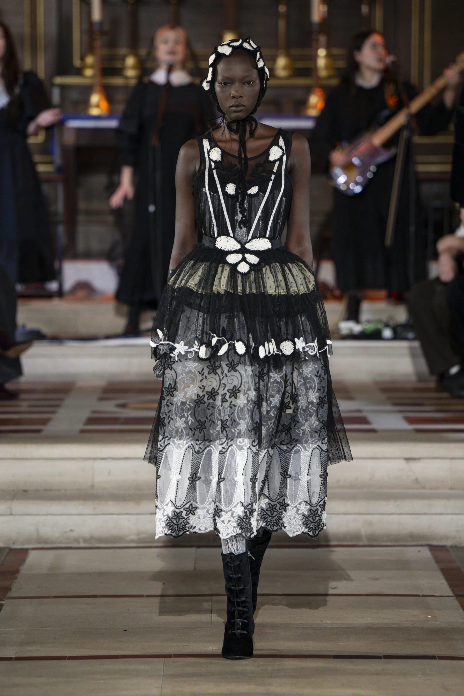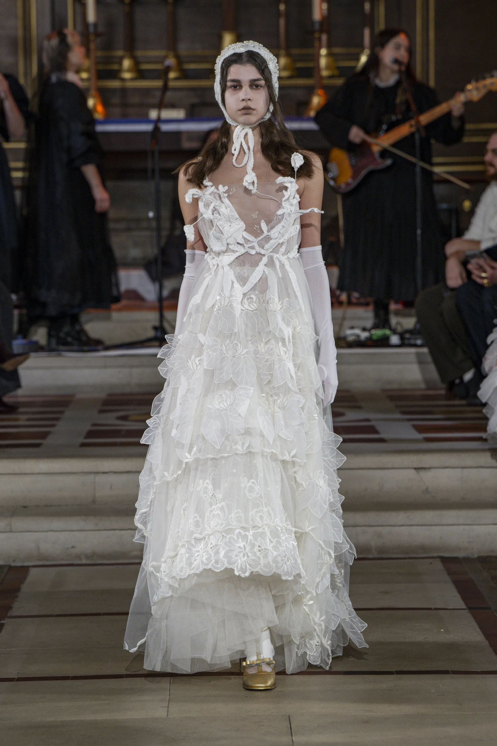 West Wycombe yakınlarındaki mağaralarda son bulan bu hüzünlü hikâye, koleksiyonda yalnızca bir ilham kaynağı olarak kalmıyor; tasarımların ruhuna dönüşüyor. Yaşam ile ölüm arasındaki ince çizgide konumlanan parçalar, dönemin işçi kıyafetlerinden esinlenen yapılandırılmış korsajları ve önlük detaylarını zamansız siluetlerle bir araya getiriyor. Tebeşir beyazı, fildişi ve solgun porselen tonları Suki’nin hayaletimsi varlığını çağrıştırıyor. Tül ve ipek organze katmanlar hafiflik duygusu yaratıyor. Narin ama huzursuz edici tığ işi çiçekler karanlıkla yoğrulmuş bir güzelliği simgeliyor. Ham kenarlar ve silik dokular zamanın izini görünür kılıyor.