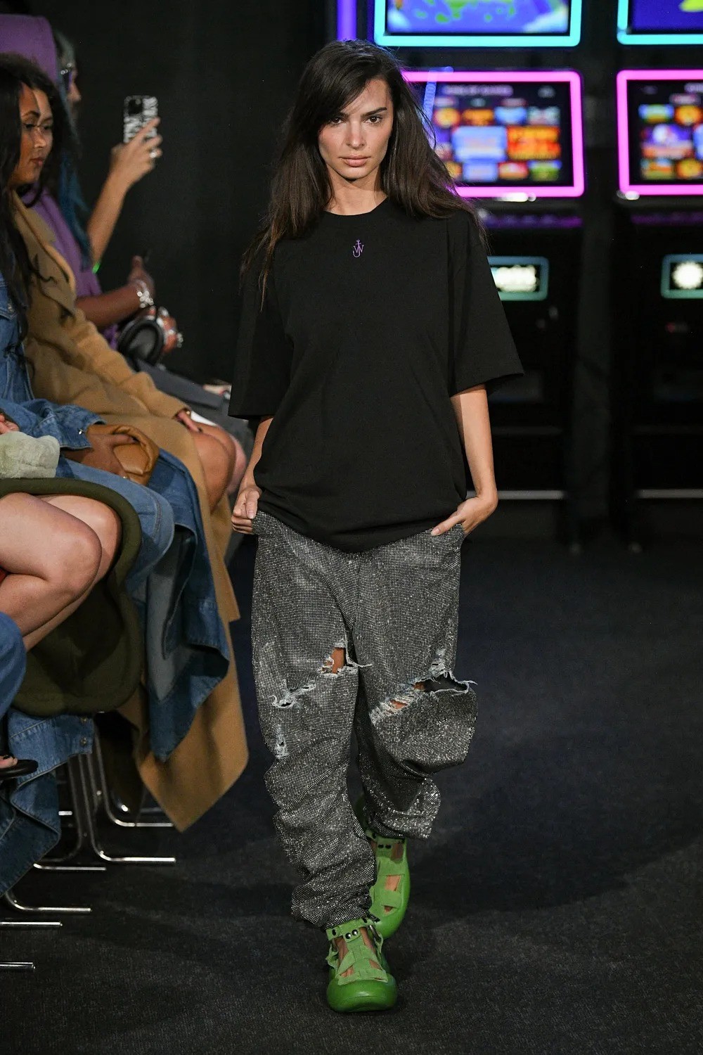 Günlük görünümlerinizde havalı ve ihtişamlı parçalar her zaman tercihinizse, bu trend sizi heyecanlandırabilir! JW Anderson, sade siyah bir tişört ile elmas detaylı bol kesim pantolonunu sergilerken, David Koma holografik çizme ve ceketleri sokak modasına davet ediyor.