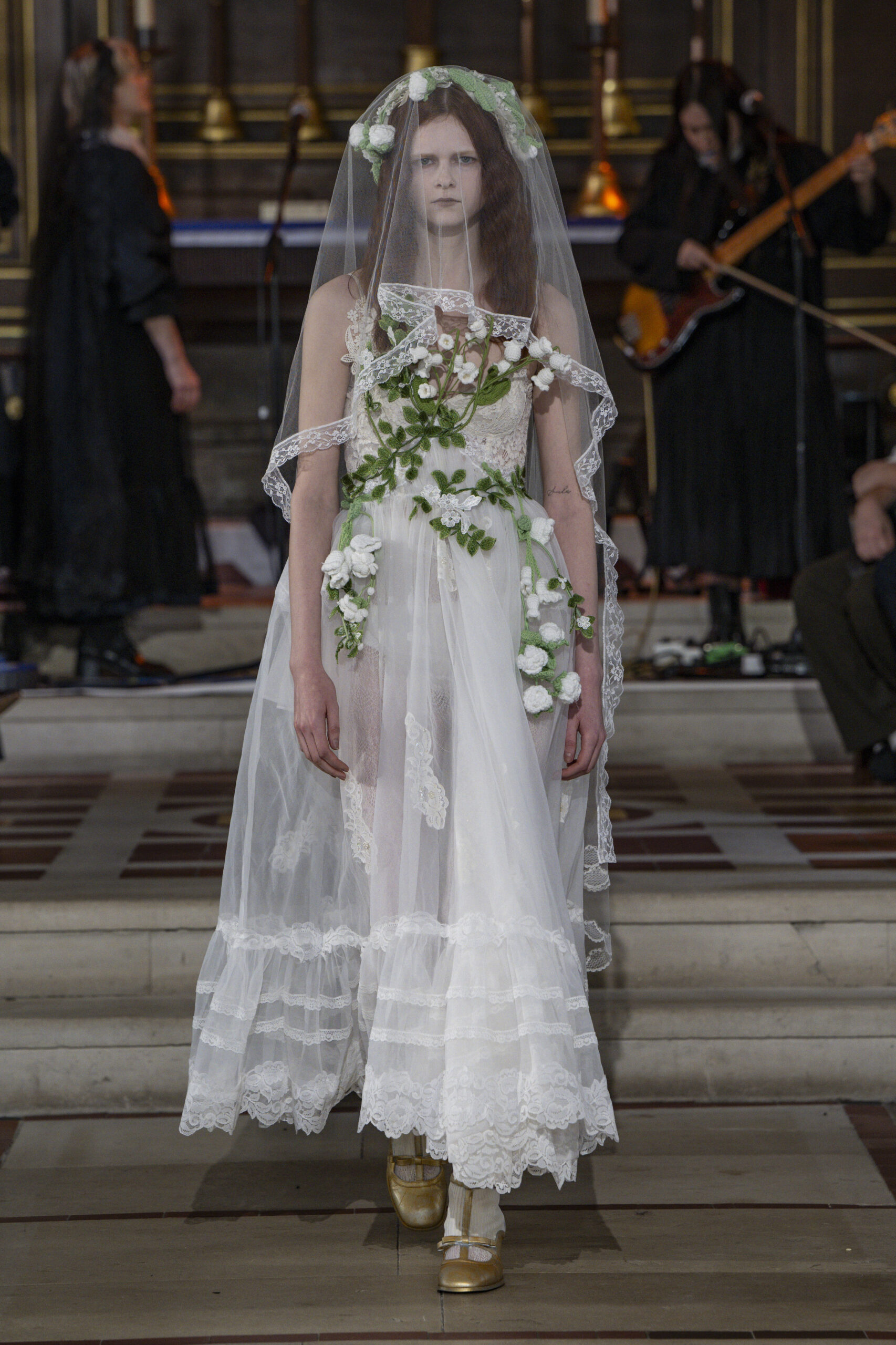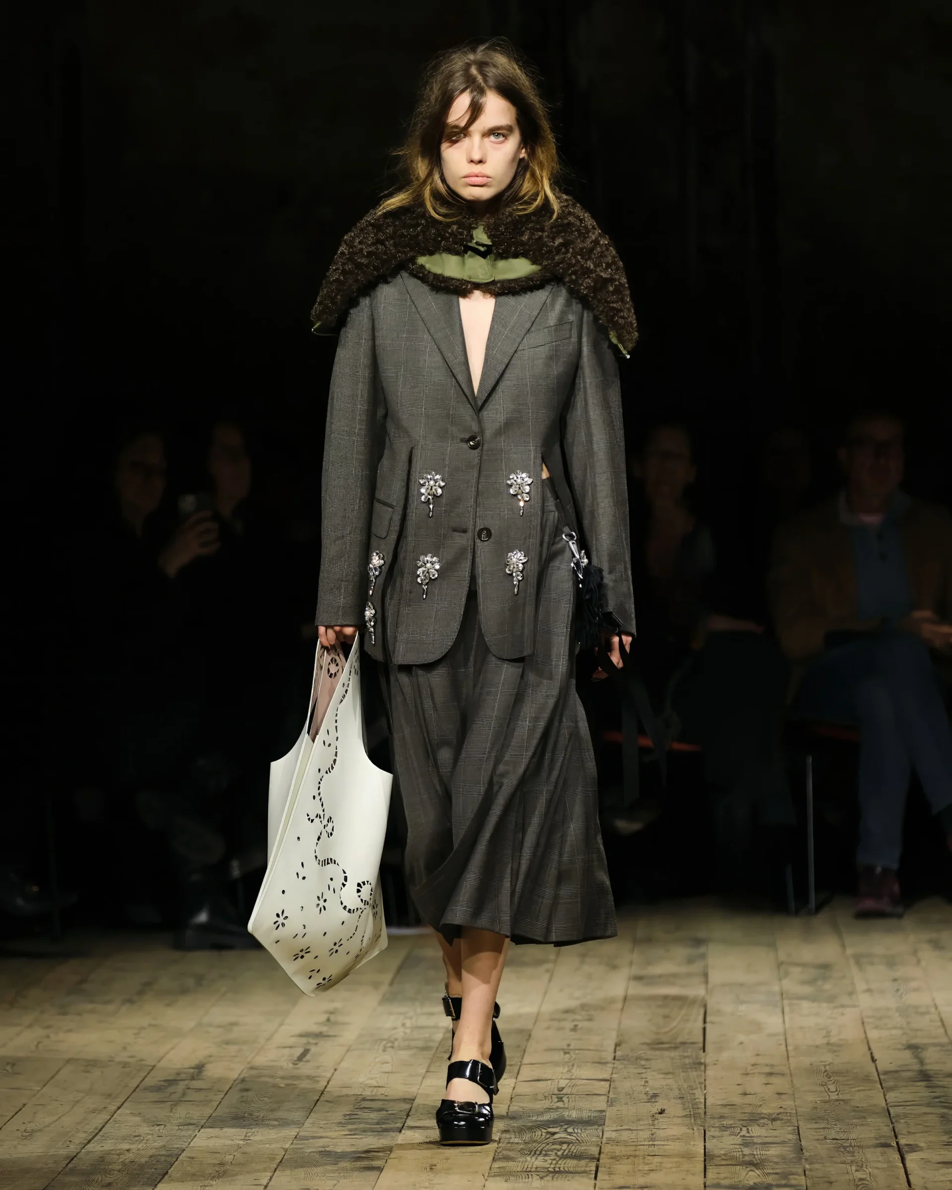 Simone Rocha, romantik ama güçlü kadın silüetleriyle sezonun en şiirsel koleksiyonlarından birine imza attı. Tül, dantel ve hacimli formlar aracılığıyla feminenlik kavramını kırılganlık ve güç arasındaki dengede yeniden yorumladı.