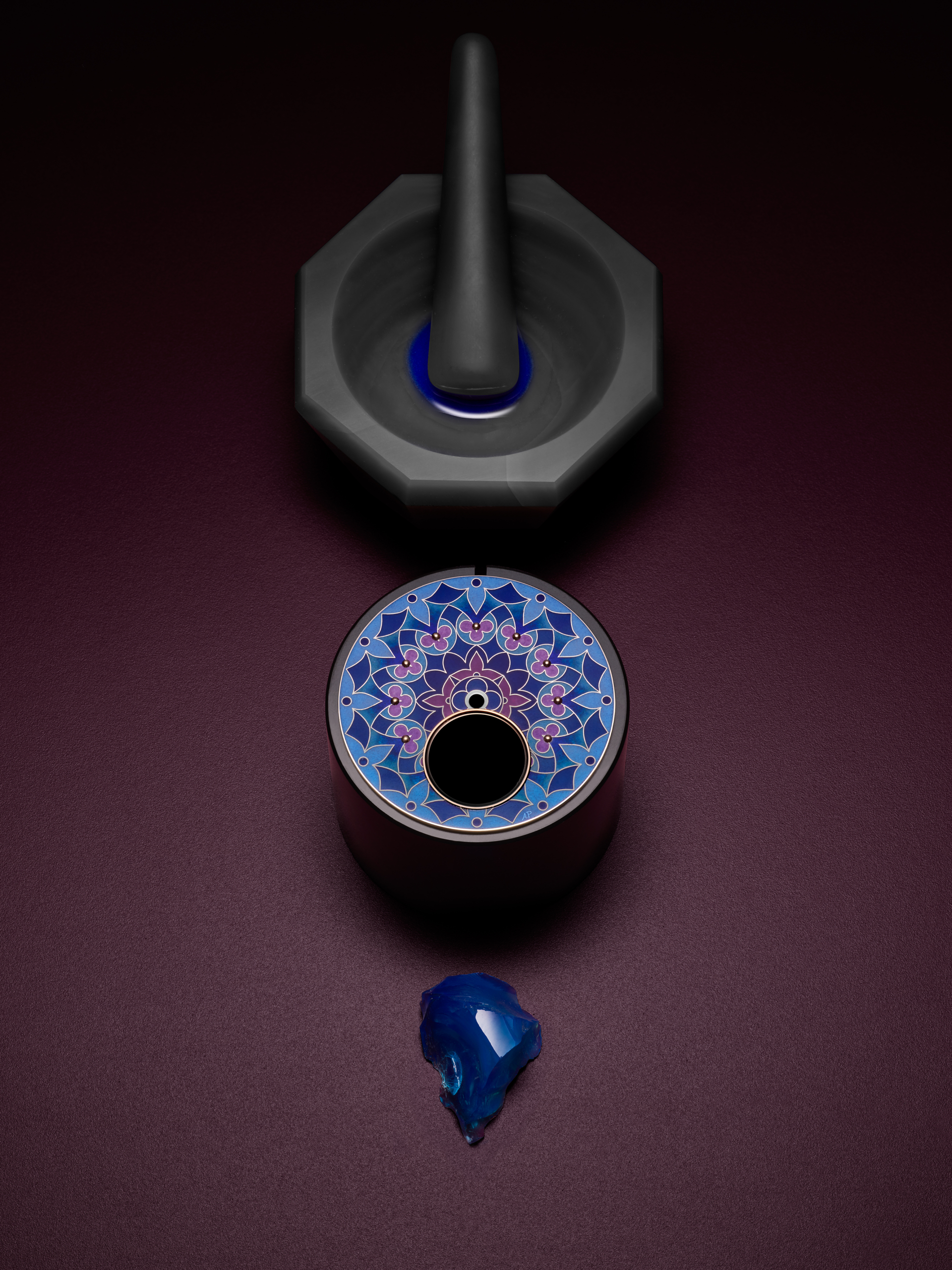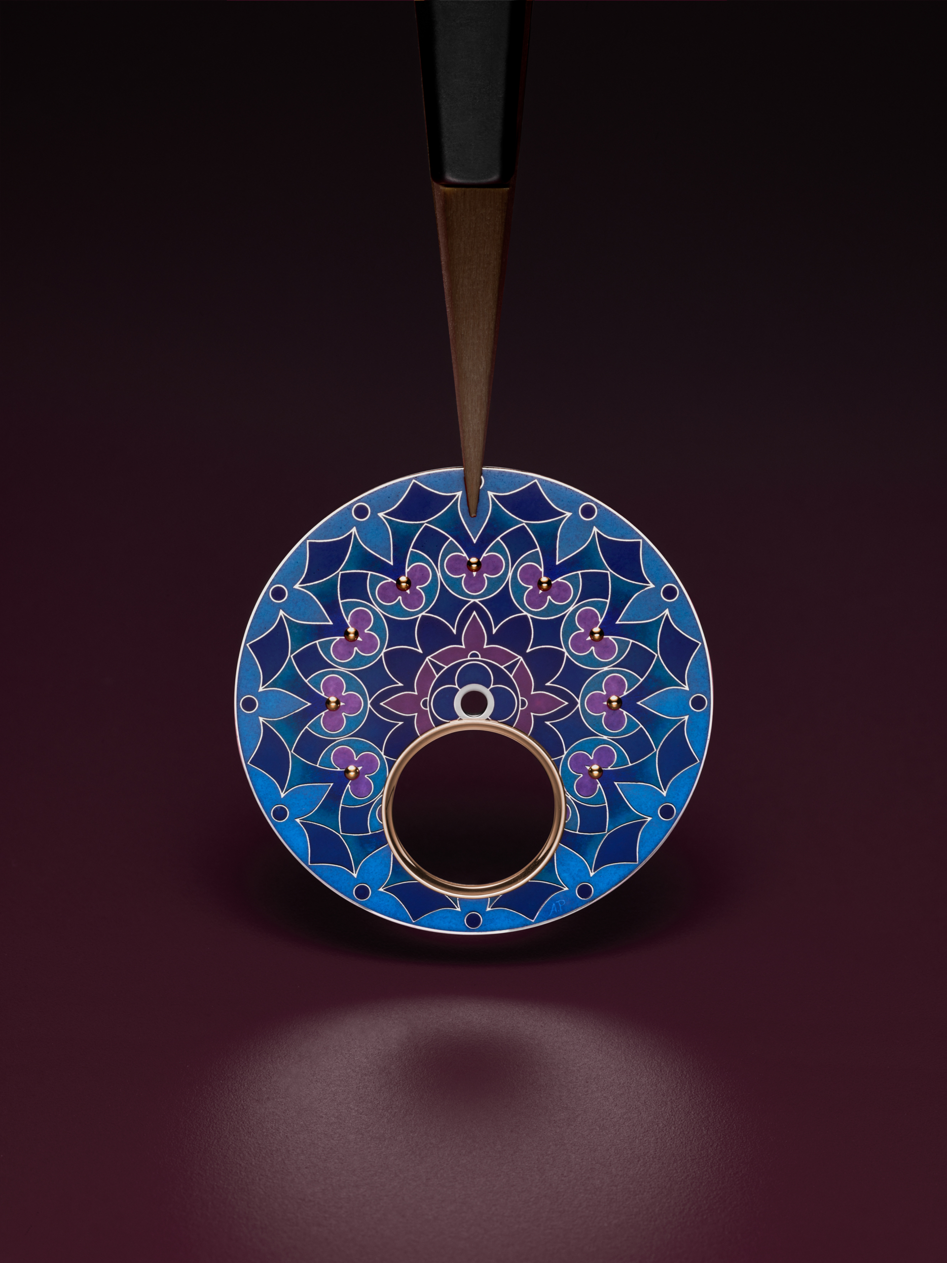 Tambour Moon Flying Tourbillon Kaleidoscope, geleneksel zanaatkarlık tekniğine çağdaş bir dokunuş olan cloisonné emaye ile yapılıyor. Altın iplikler kullanan zanaatkar, ince bölmeler oluşturarak desenler çiziyor ve bu bölmeler daha sonra emaye ile dolduruluyor. Kadranın “tuvalini” imzasız bırakarak Louis Vuitton, cloisonné emaye detaylarının parlamasına izin vermeyi terich ediyor. Bu nedenle kadranın tamamı Anita Porchet’in emaye işçiliğine ayrılıyor. Mor emayecilikte elde edilmesi en zor renk olduğundan kullanılan tonları mükemmelleştirmek için haftalarca araştırma yapılması gerekiyor. İstenilen mor renk antika emayeler kullanarak yaratılıyor. Louis Vuitton, mavinin varyasyonlarının yanı sıra, kadranın kaleydoskopik etkisini güçlendirmek için kademeli olarak çok sayıda yoğun mor ton kullanılmasını istedi. Bu son derece hassas işlem, emayeyi oluşturan bileşenler (silika tozu ve metal oksitler) arasında mükemmel bir denge gerektiriyor. Bu hassas denge sadece Anita Porchet’inki kadar uzman, hassas ve becerikli bir elin başarabileceği yüksek bir zanaatkarlıkla sağlanıyor. Öyle ki yalnızca kadranın dekorasyonun tamamlanması bile 2 hafta sürüyor.