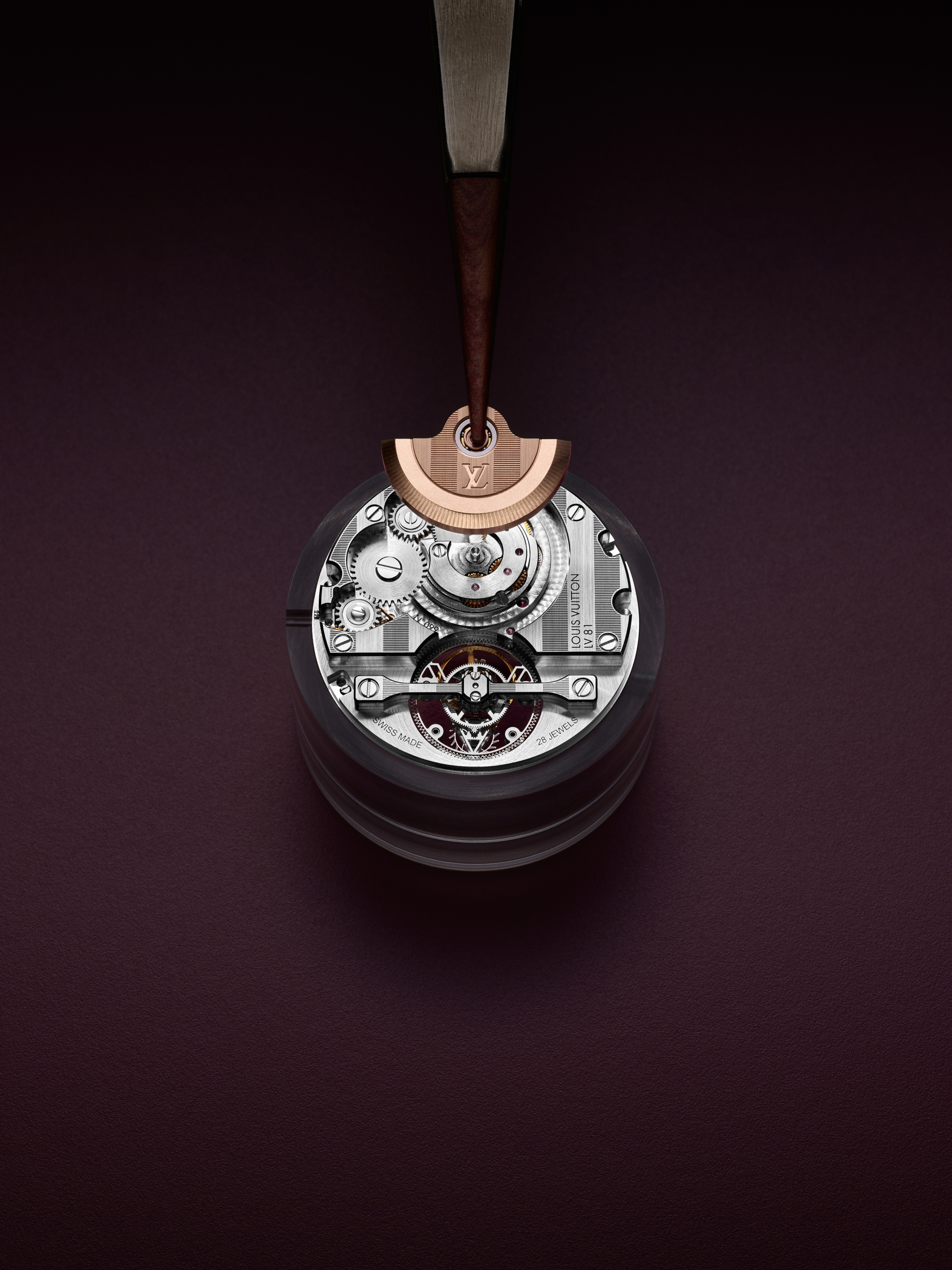 Tambour Moon Flying Tourbillon’u eşleştirmek için Louis Vuitton, kaleydoskopik yüzünün canlılığını saatin en güzel otomatik kurmalı mekanizmalarından biri olan, tamamen La Fabrique du Temps’da tasarlanan, geliştirilen ve monte edilen uçan tourbillon LV 81 kalibresiyle donatıyor. Saat 6 yönündeki ikonik regülatör, uçan tourbillon taşıyıcısının kalbindeki Gaston-Louis Vuitton’un V’sini ortaya çıkaran zarif bir tasarıma sahip hale geliyor. Kasa arkasındaki safir kristal, mikro rotora ve saat mekanizmasına bir pencere açıyor. Hassas süslemesi, 1858 yılında yaratılan çizgili Trianon kanvasını hatırlatıyor.
