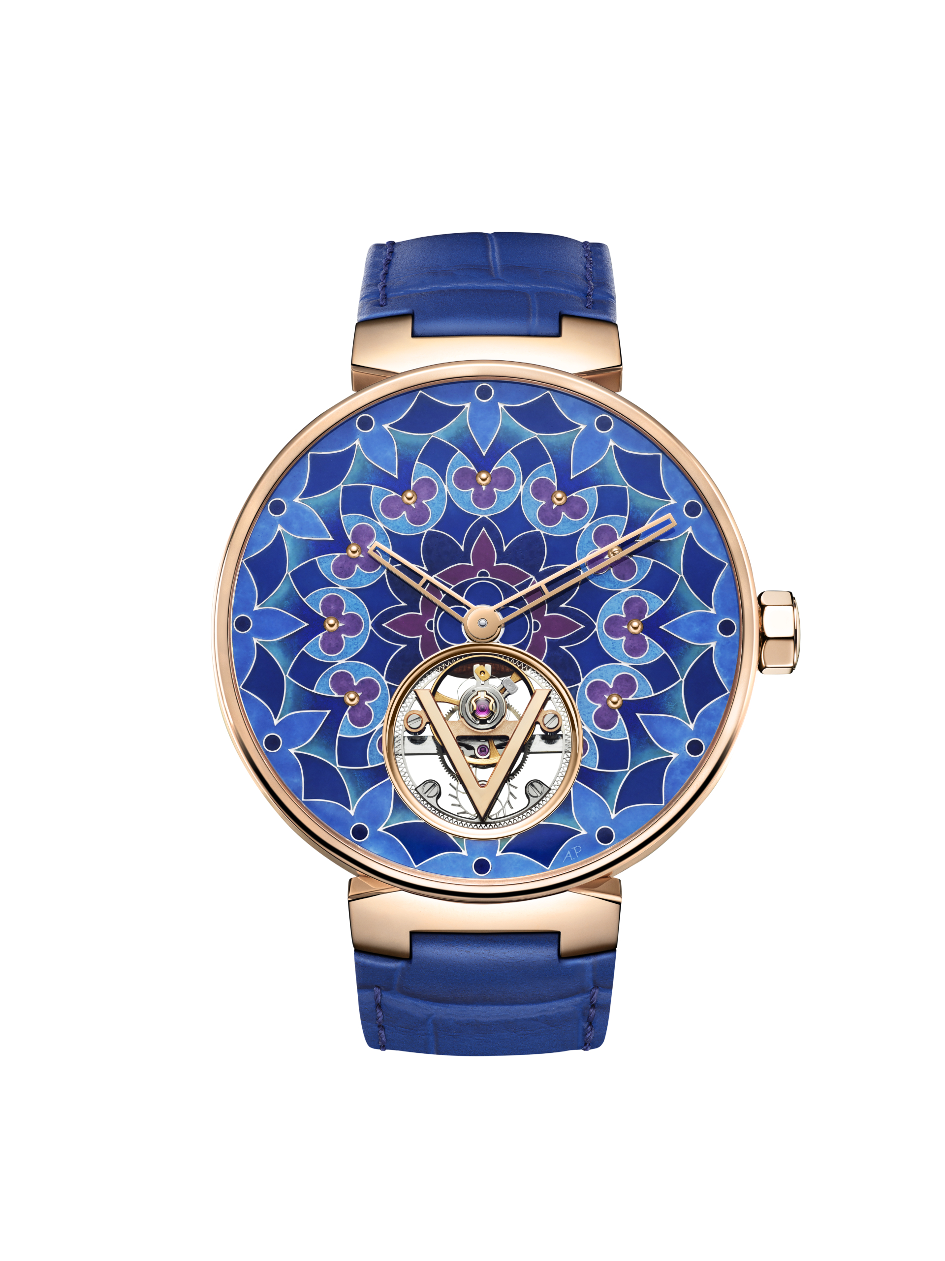 Bu yeni saat, geleneksel cloisonné emaye zanaatkarlığı ile “Monogram Flower”ın sanatsal bir formda yeniden yorumlanışını bir araya getiriyor. Bu cesur kaleydoskopu hayata geçirmek için Louis Vuitton, tamamen La Fabrique du Temps’da üretilen benzersiz bir uçan tourbillon kalibre tercih ediyor.