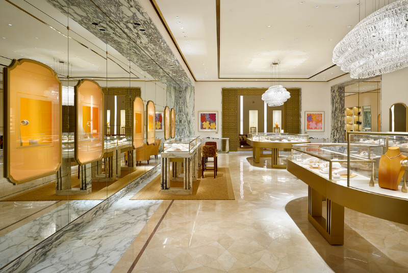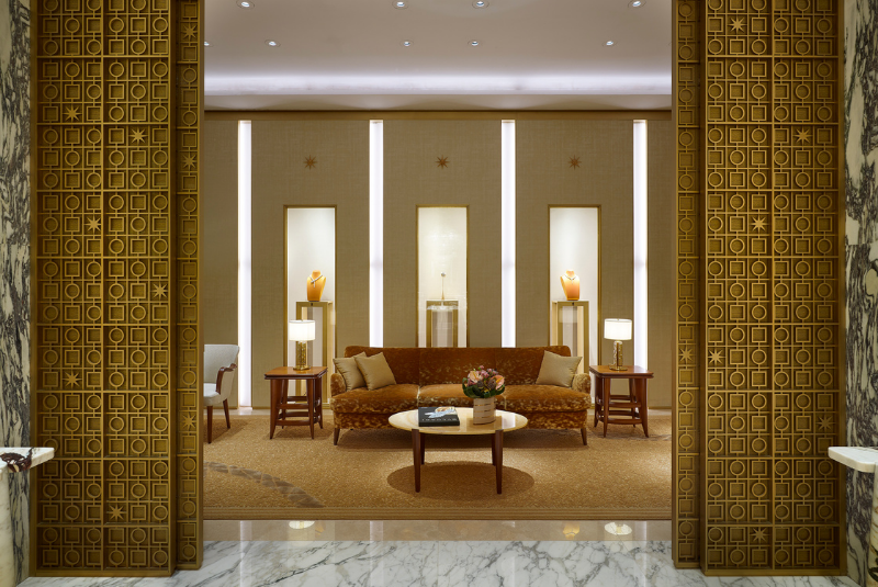 Butikte Bulgari’nin en ikonik koleksiyonlarını keşfedebileceğiniz iki vitrin bulunuyor. Vitrinler arasında denge, uyum ve kozmik düzenin sembolü sekiz köşeli Condotti yıldızı konumlanıyor. Pirinç ve camdan oluşan bu vitrinler, el yapımı Murano camından yapılmış muhteşem bir avize ile de taçlandırılıyor. Duvarlarda safran rengi şantung ipeği ile süslenen ikonik Condotti pencereler ise oldukça dikkat çekiyor.
