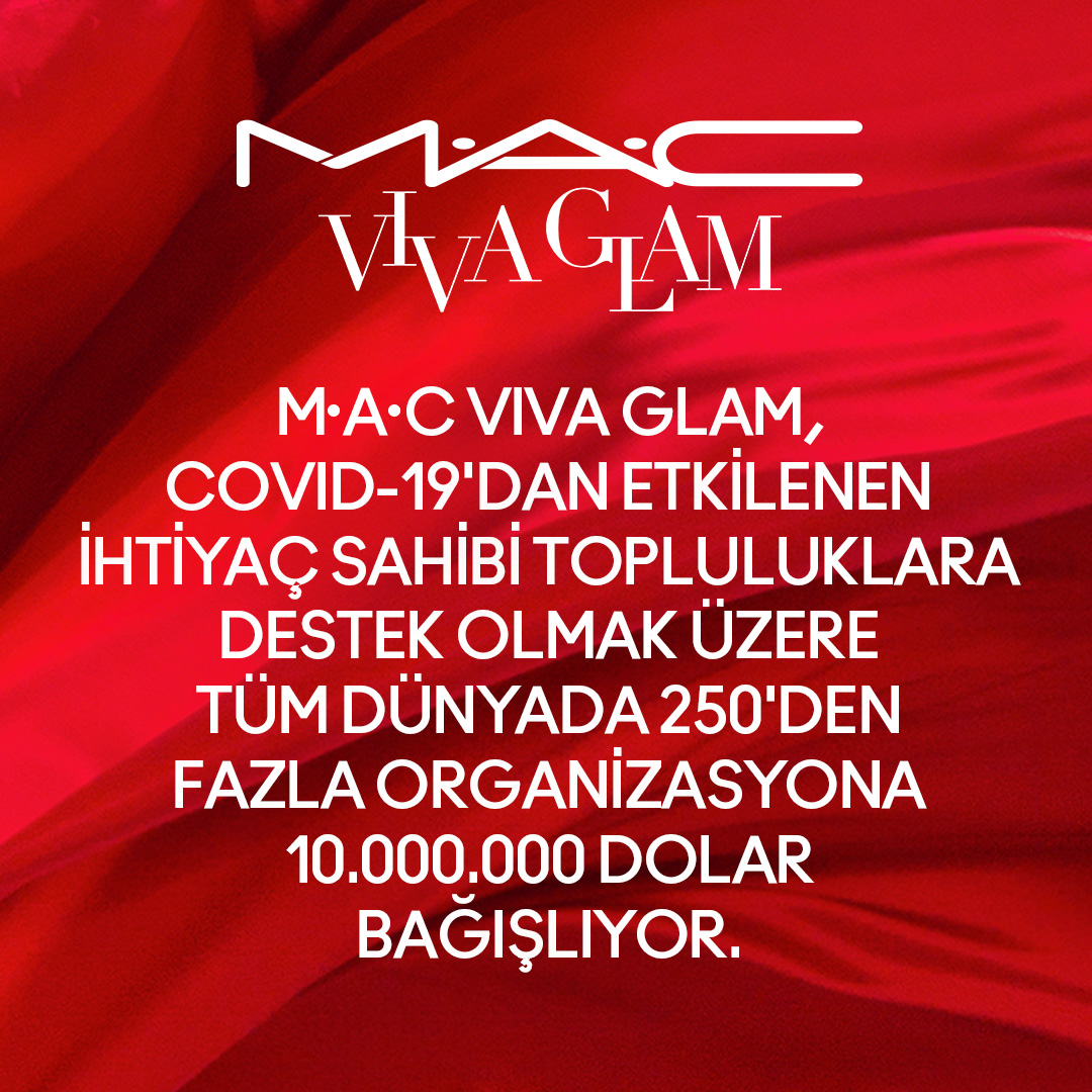 M·A·C Cosmetics, temel ihtiyaç ve hizmetlere yönelik faaliyet gösteren organizasyonları desteklediği VIVA GLAM kampanyasıyla toplam 250 kuruluşa COVID-19’a karşı temel ihtiyaç hizmetlerini devam ettirebilmeleri için 10 milyon dolar bağışlıyor. Marka, MAC VIVA GLAM’in birincil bağışına ek olarak herkesi, satışından elde edilecek gelirinin %100’ünün ihtiyaç sahibi komitelere bağışlanacağı VIVA GLAM rujlardan almaya, böylelikle evlerinden destek vermeye davet ediyor.