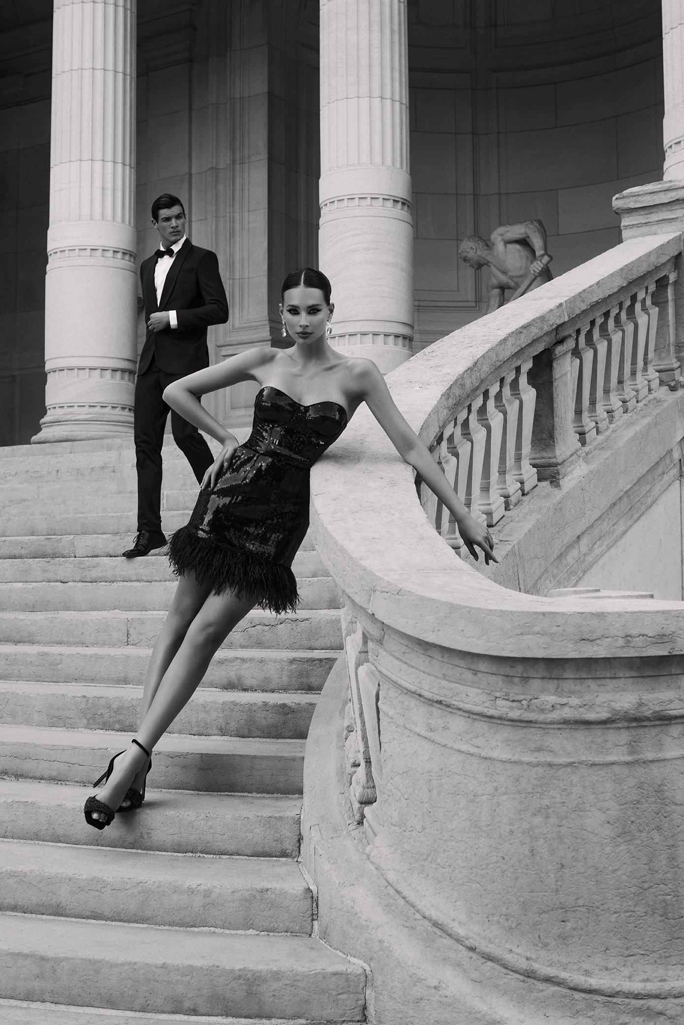 Flapper tarzını vintage bir tarzla bir araya getiren bu çarpıcı koleksiyon, tatil sezonu için mükemmel bir seçenek. Uzun rayon püsküllü saçaklar, göz kamaştırıcı payetler, tüp boncuklar, tüyler, danteller ve parlak satenlerle bezenen mini elbiseler, vücuda tam oturan hatlarıyla göz dolduruyor. Göz alıcı uzun elbiseler ise sırtı açık formlar, beli ön plana çıkaran kesimler ve zarif boncuklarla dikkatleri çekiyor. Kendinden emin ve feminen bir hava yaratan blazer ceket ve pantolon takımı, büyüleyici bir korse üst veya tüy detaylı, ip askılı kaşkorseyle tamamlanarak eşsiz bir görünüm sunuyor. Uzun kollu, ışıltılı crop top ve ön yırtmacıyla hayran bırakan uzun etek ise, bu karşı konulmaz koleksiyona son dokunuşları yapıyor. Öte yandan cömert renk paletinde, elektrik mavisi ve bordo esintiler taşıyan parlak siyah, saten krem, ışıltılı altın ve gümüşi metalik renkler karşımıza çıkıyor.