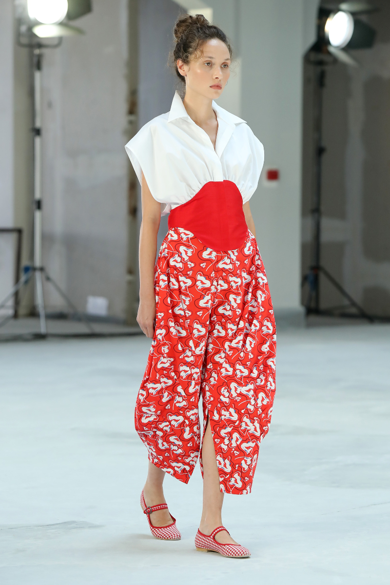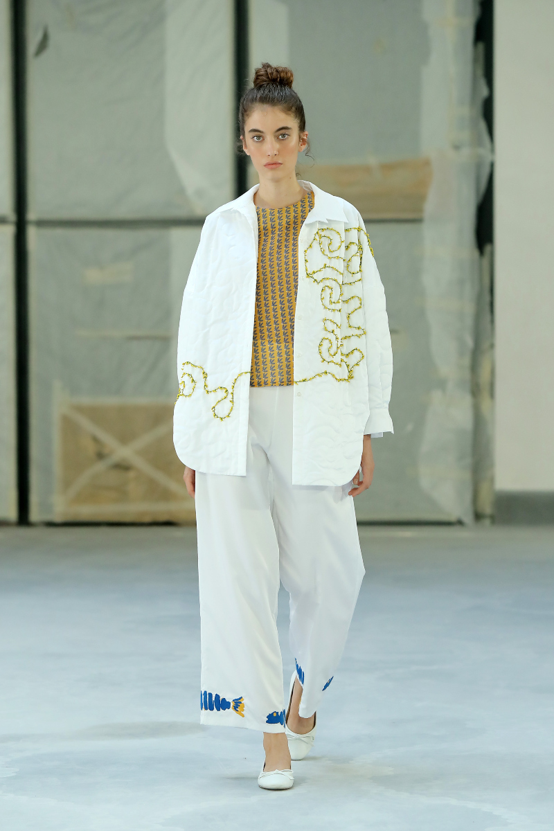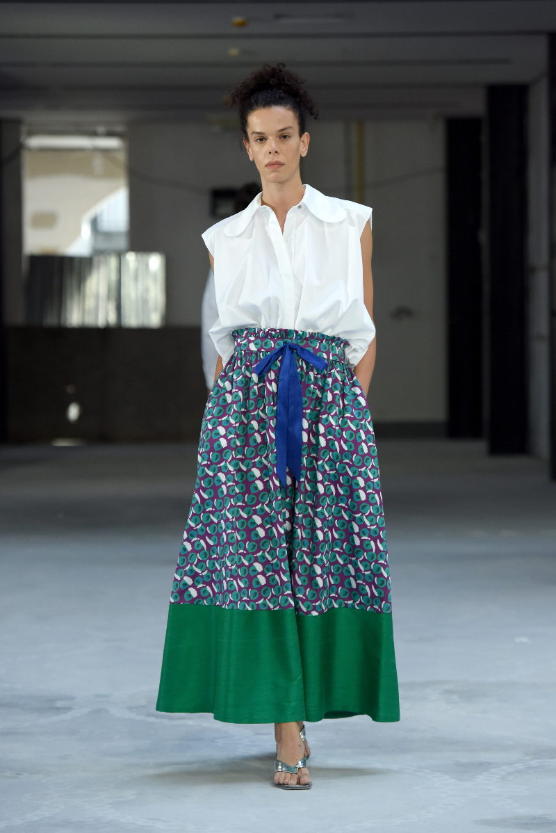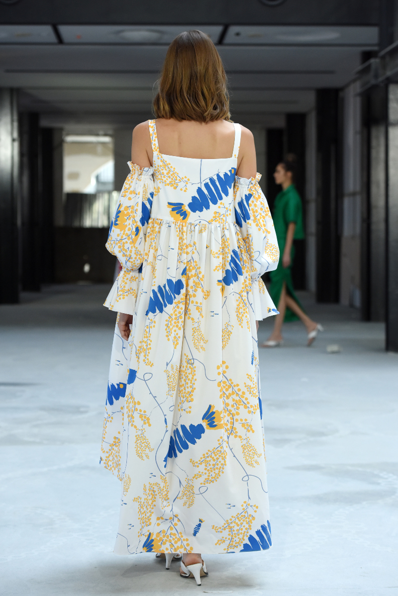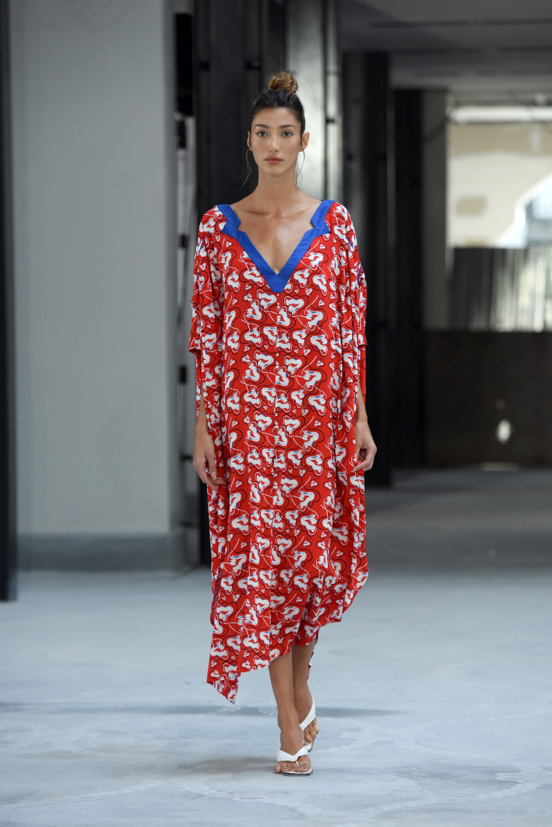 Koleksiyonda Mehtap Elaidi’nin imzası olan kup oyunları başı çekerken detaylarda balon, pli, drape ve volan detayları öne çıkıyor. Bu silüetler canlı desenlerde hayat buluyor ve bu desenlere kırmızı, yeşil, mavi ve bej tonlarından oluşan bir renk paleti eşlik ediyor. Bolca kullanılan beyaz poplin de bu canlılığa bir tezat oluşturup izleyicinin gözlerini ve içini ferahlatmayı amaçlıyor.