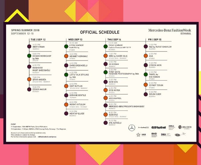 Mercedes-Benz Fashion Week Istanbul 10. sezon takvimi belli oldu. 12-15 Eylül 2017 tarihleri arasında gerçekleşecek olan Mercedes-Benz Fashion Week Istanbul’un defile alanı ise Zorlu PSM. Tasarımcıların ve markaların 2018 İlkbahar / Yaz koleksiyonlarıyla tanışacağımız bu haftada karşımızda heyecanlandıran bir takvim yer almakta. Mercedes-Benz Fashion Week Istanbul’a dair gelişmeler için ise takipte kalınız.