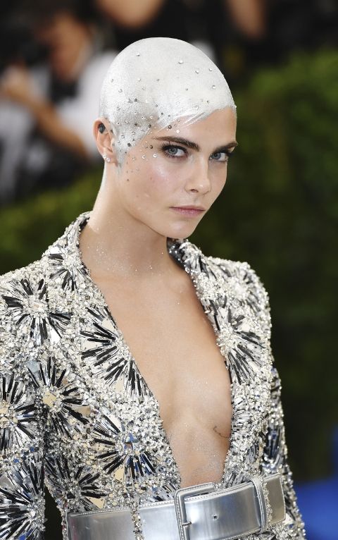 Gecenin en dikkat çekici ve cesur güzellik görünümlerinden birine imza atan Delevingne, gümüşe boyayıp taşlarla süslediği başıyla daha çok uzay temasını yansıtıyordu.