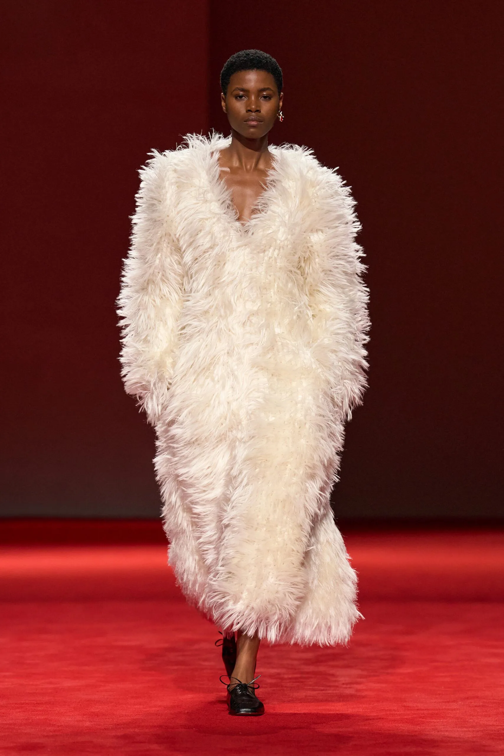 Louise Trotter’ın ikinci koleksiyonu duyusal bir deneyimdi. Şekillendirilmiş fiberglas formlar, hacimli shearling paltolar ve dokunma isteği uyandıran yüzeyler…