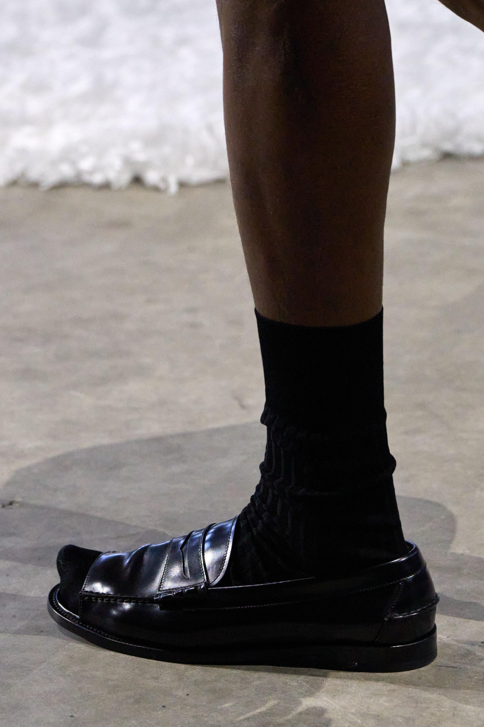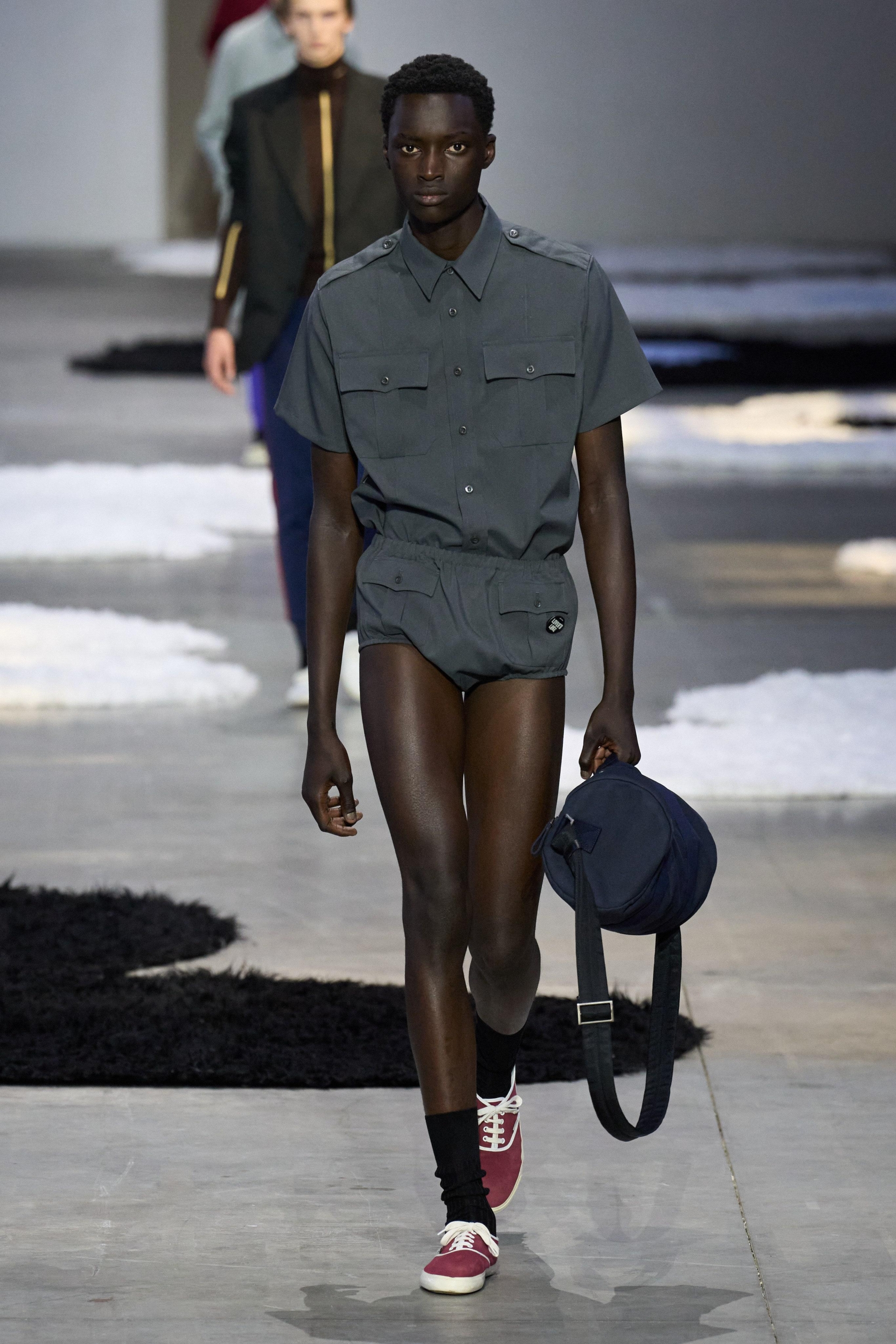 Birkaç yıl önce kırmızı halılarda ve ekranlarda kadın koleksiyonunun yıldızı olan Miu Miu “hot pants”’lerinin bu kez erkek versiyonlarıyla karşımıza çıkması, koleksiyonun en heyecan verici anlarından biriydi. Bu tercih bir tek cinsiyet kalıplarıyla değil, aynı zamanda trend döngüsünün kısa döngüleriyle de cesurca oynuyordu.