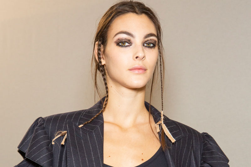 Tom Pecheux sayesinde karanlık, dumanlı gözler ve çıplak dudaklar MaxMara Sonbahar / KIş 2020 podyumuna egemen oldu. Modeller; saç uçlarında yıpranmış bej şeritler ile vurgulanan tek örgüleri ile etkileyici görünüyor.
