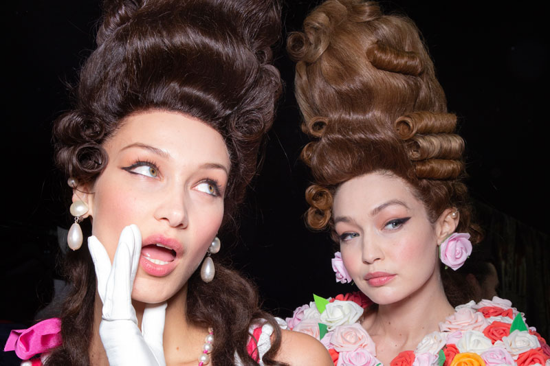 Moschino Sonbahar / Kış 2020 defilesinin rüya gibi saç stillerinin esin kaynağı ise; Marie Antoinette. Saçları tamamlayan aynı derecede etkili dramatik pembe yanaklar ve yoğun siyah göz kalemi göz ardı edilemeyecek olanlardan.