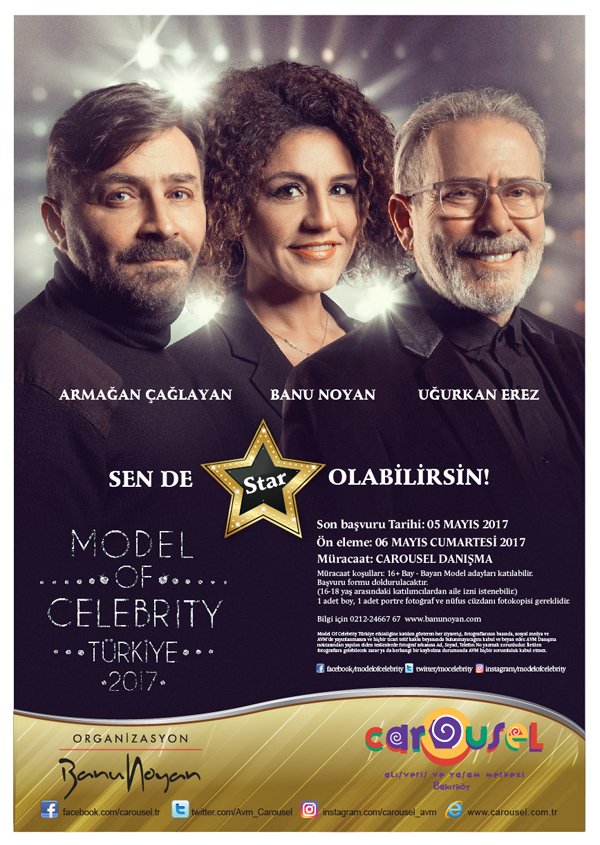 Ünlü Jüriler; Armağan ÇAĞLAYAN, Uğurkan EREZ, ve Banu NOYAN “Model Of Celebrity” için yapılacak ön elemede bir araya gelerek genç yetenekleri ve özel yüzleri Carousel’de keşfedecekler.