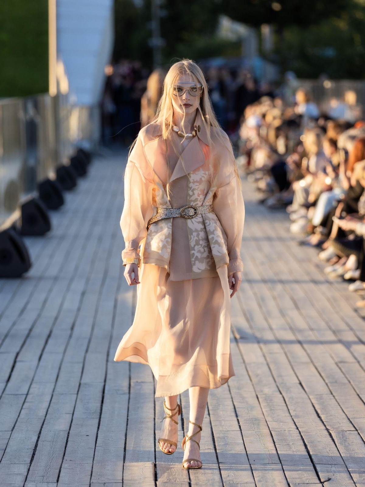 Öne çıkan parçalardan biri, pudra tonlarında akışkan kumaştan tasarlanmış sofistike bir trençkot. Üst bölümde kullanılan yoğun ve desenli materyalden aplikeler, görünümü etkileyici biçimde güçlendiriyor. Göz alıcı bir diğer look ise hafif ve yarı transparan bir kumaştan tasarlanmış, vücuda oturan şeftali tonlarında midi bir elbise. Silüet sade ve zarif hatlarını korurken, hem üst hem de alt kısımlara eklenen ışıltılı payet detayları, tasarıma beklenmedik bir ihtişam katarak bu rafine görünümü güçlü bir stile dönüştürüyor.