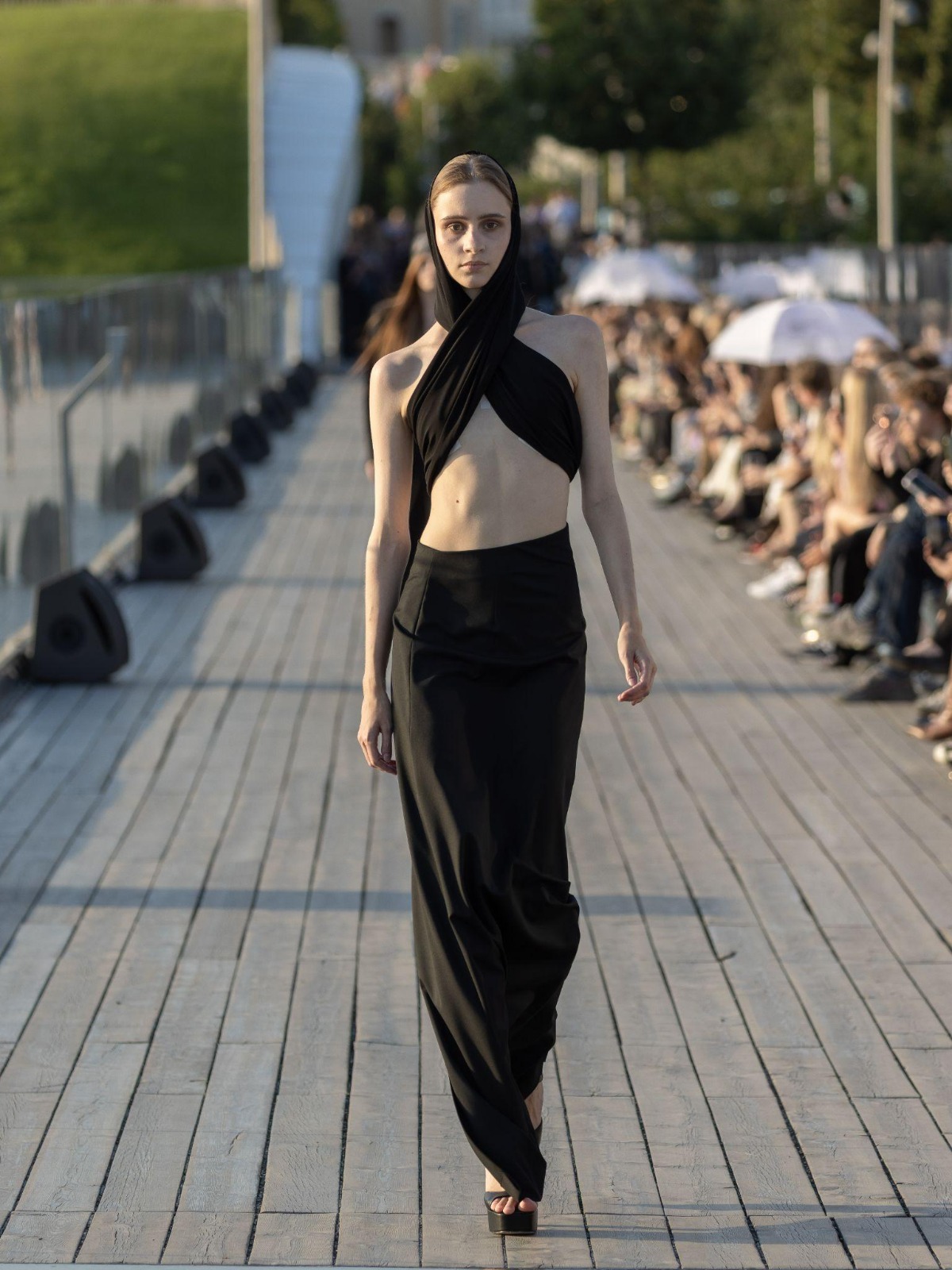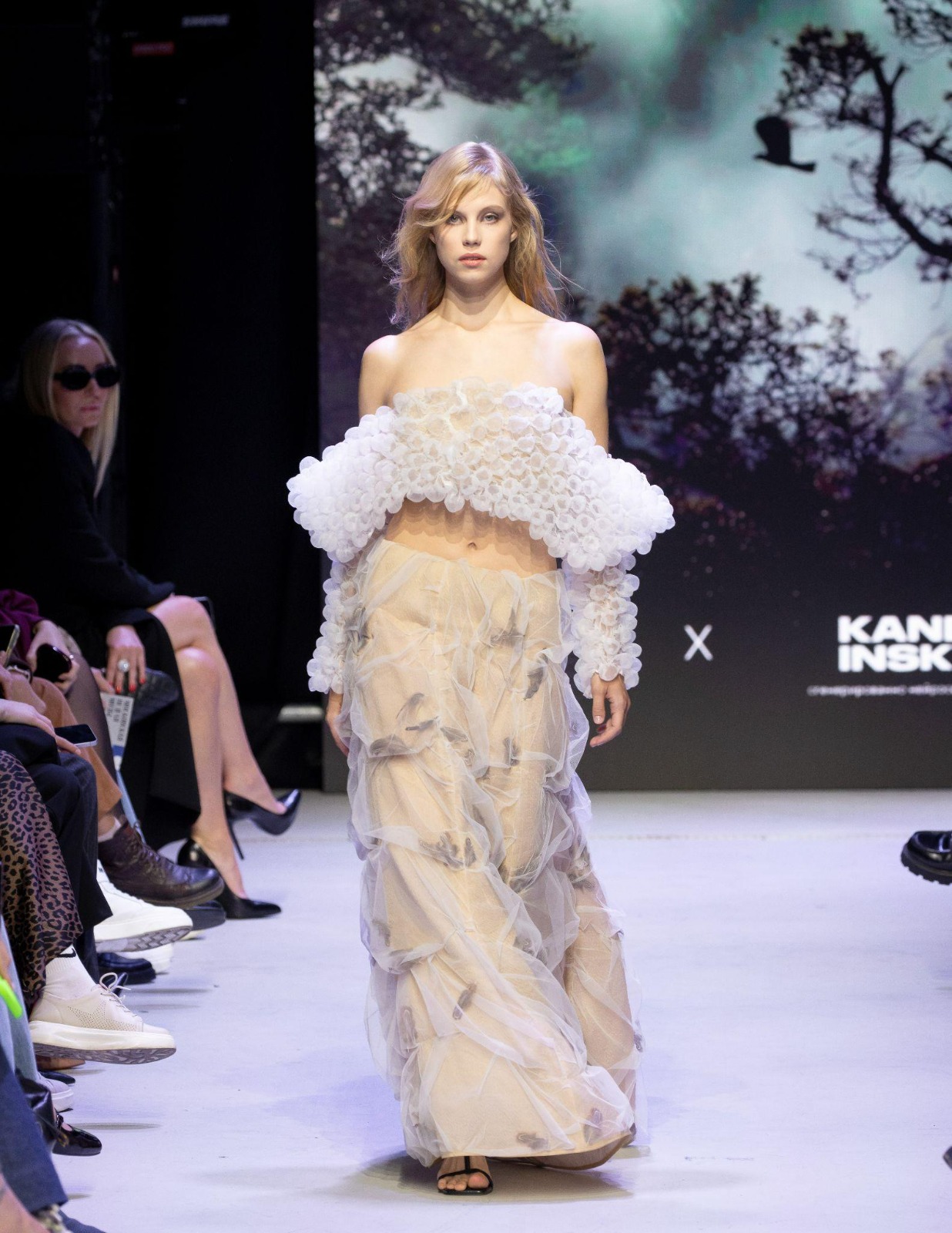 Tatiana Kotova markası, gece bahçesi atmosferini kusursuz bir şekilde yansıtan, yalın görünümlü ama etkisi güçlü detaylar etrafında şekillenen “Night Garden” adlı koleksiyonunu sundu. Koleksiyonda crop kesim, omuzları açık bir bluzun yere kadar uzanan etekle kombinlendiği gerçekten büyülü bir look öne çıkıyor. Her iki parça da yumuşak, nötr tonlarda ve sade silüetlere sahip, ancak özenle seçilmiş dekoratif detaylar ince bir drama katıyor. Bluz, baloncukları andıran dokulu bir malzemeden tasarlanırken, maksi etek bej kumaş üzerine kusursuz beyaz drapelerle katmanlanarak etkileyici bir doku oyunu yaratıyor.
