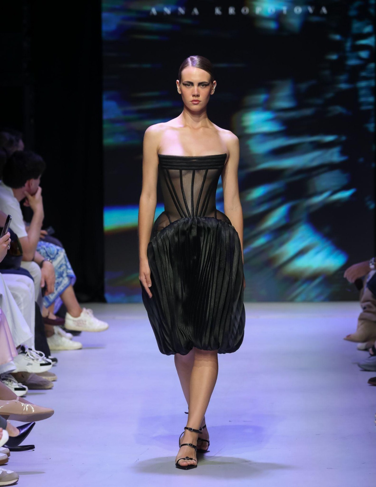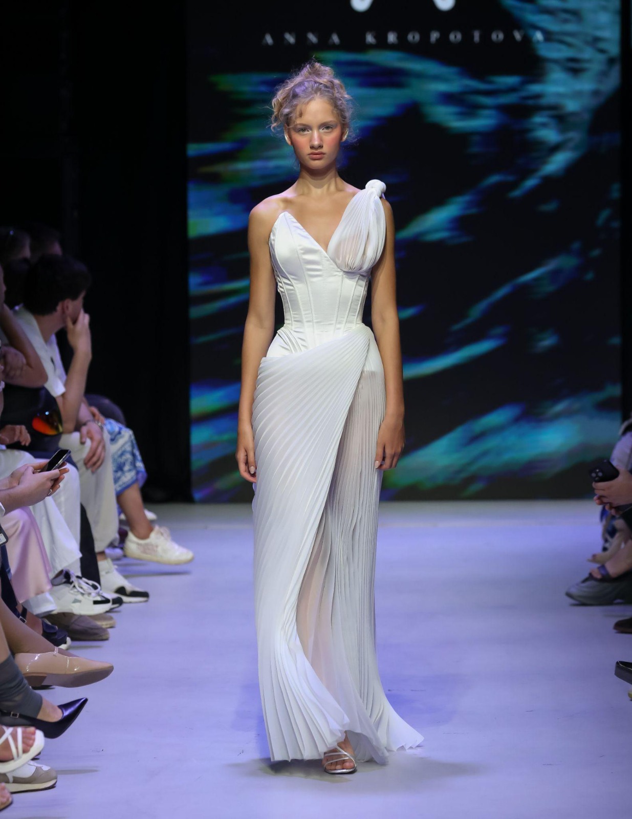 Anna Kropotova’nın imzası, organza kumaşını kendi özel pileleme tekniği ile ustaca kullanmasında yatıyor. Bu sayede bilindik tasarımları neredeyse heykelsi ve mimari formlara dönüştürüyor. Bu teknik, hacimle oynayarak adeta “hareketli bir mimari” etkisi yaratıyor. Koleksiyonda ise tasarımcı, her parçanın zarafetini yükselten bir motif olarak buzun kristal güzelliğinden ilham alıyor. Koleksiyonda gözleri anında üzerine çeken look’lardan biri, ters çevrilmiş lale formunda kısa bir elbise. Transparan kumaşı ve onun ortaya çıkardığı narin kıvrımlar elbiseyi öne çıkarırken bu sırada pilili etek ucu, baştan çıkarıcı mini elbiseye hem hareketli hem de incelikli bir duruş katıyor. Buz etkisi, keskin hatlara sahip, yere kadar uzanan, bembeyaz bir elbiseden oluşan ikinci look’ta da devam ediyor. Burada markanın imzası haline gelen plise yine başrolde etek ucunu asimetrik bir şekilde süslerken, büstiyerde kupun yerini alarak çarpıcı ve dokulu bir ifade yaratıyor.