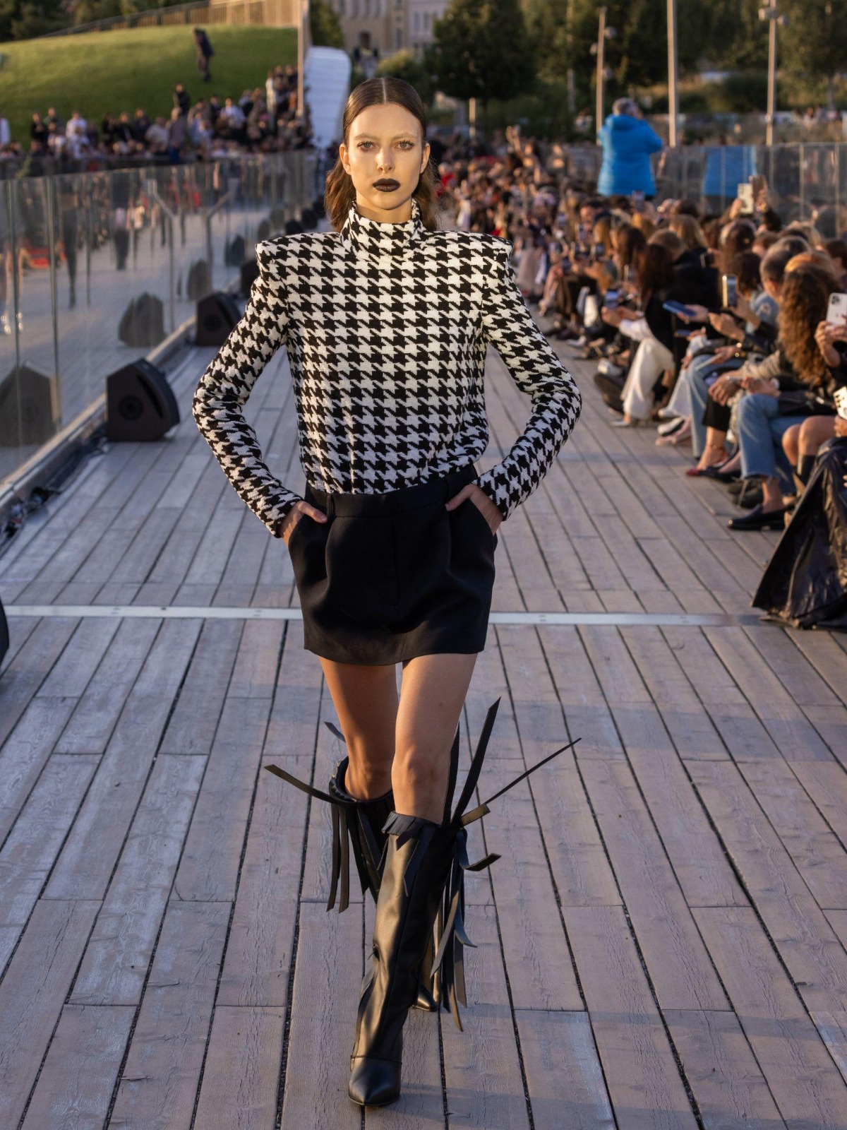 İkinci görünüm daha ciddi bir tavır taşıyor: Koyu renkli, terzilik kesimli bir mini etek, kazayağı desenli bir bluz ve şık deri çizmeler, kombinin ana “kahramanları” olarak öne çıkıyor. Bu look’ta ise farkı yaratan detaylar. Geometrik vatkalar, sade bluzu öne çıkararak ona teatral bir hava verirken geniş deri püsküller, minimalist çizmeleri çerçeveleyerek enerji katıyor ve kombinin sönük değil, dinamik kalmasını sağlıyor.