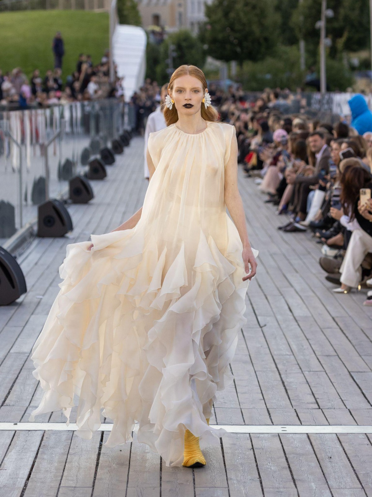 Alexander Arutyunov koleksiyonu, zamanı merkeze alırken sıradan bir nesnenin, kokuların, renklerin ve duyguların birlikte var olduğu bir iç dünyayı nasıl açığa çıkarabileceğini gözler önüne seriyor. Koleksiyon boyunca nostalji özellikle de farklı stillerin oyunbaz karşıtlıklarla yan yana getirildiği görünümlerde güçlü bir şekilde hissediliyor. Parçalar arasında neredeyse “görünmez” hafiflikteki bir kumaştan tasarlanmış, krem renginde, yere kadar uzanan bir elbise hemen fark ediliyor. Elbise, cesur detaylar içermemesine rağmen, etek ucuna incelikle işlenmiş zarif fırfırlar, asla abartıya kaçmadan görünüme hareket ve zarif bir drama katıyor.