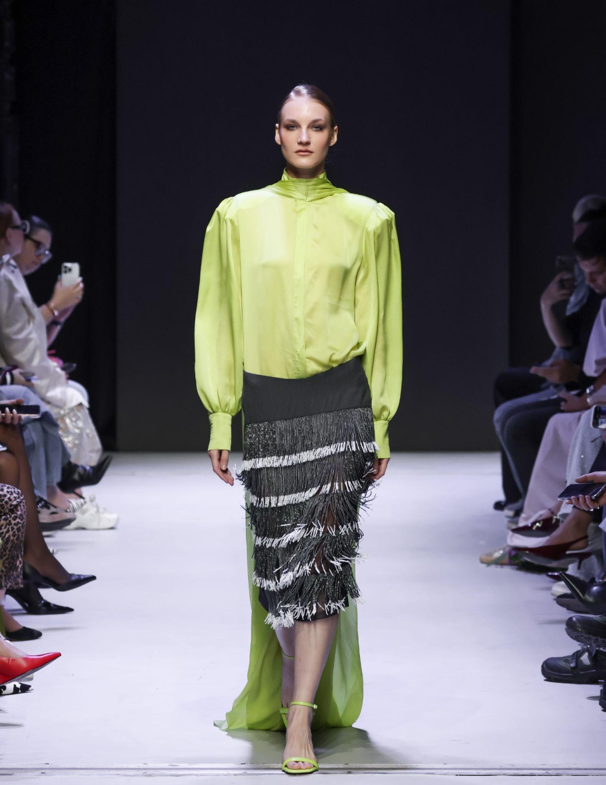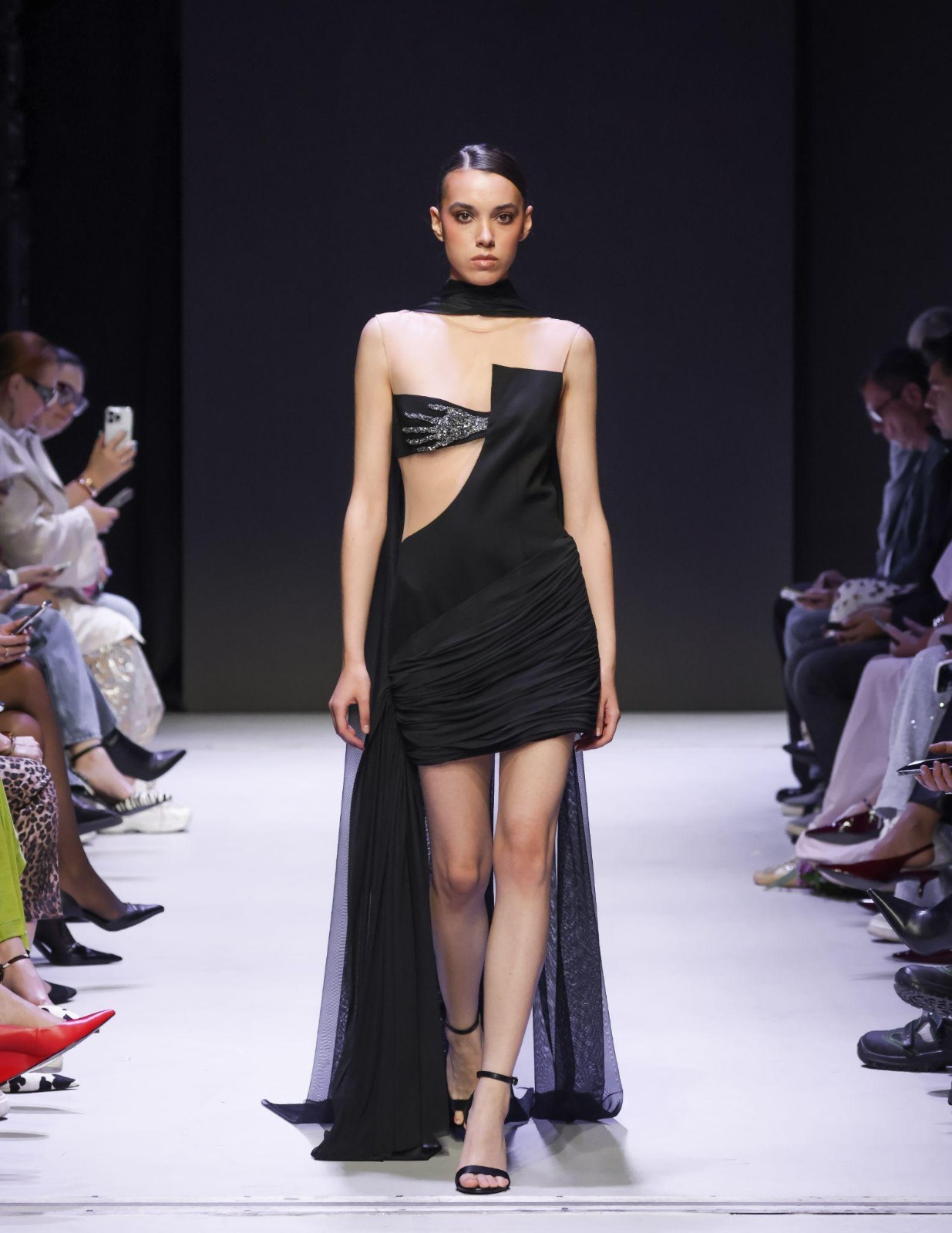 Hayk Avanesyan, zarafeti cesur ve beklenmedik detaylarla ustaca birleştiren, göz kamaştırıcı gece elbiselerini tanıttı. Öne çıkan görünümlerden biri, elma renginde arkası uzun bluz ile düşük bel kesimli ve iki tonlu püsküllerle süslenmiş grafit midi etekten oluşuyor. Abiye tutkunları için bir diğer dikkat çeken tasarım, drapeli etek ucu ve asil bir kuyrukla tamamlanan, dekonstrüktif detaylarla hareketlendirilmiş, vücudu saran cut-out bir mini elbise oluyor. Ancak tüm bu çarpıcı unsurların arasında dahi önüne geçen küçük ama büyüleyici bir detay var: gövdeye yerleştirilen yapay elmaslarla kaplı mikro bir bandeau üst. Üzerindeki el şeklinde dizilmiş taşlar hali hazırda dramatik olan görünüme oyunbaz, haute couture esintili bir hava katıyor.