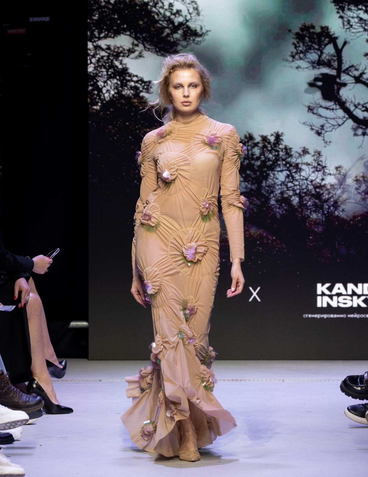 Koleksiyonun ikinci görünümü ise tam anlamıyla saf ve iddialı bir zarafet yayıyor. Tasarımcı, vücudu saran bej tonlarındaki bu elbiseyi fazla açık bir görünüm yaratmamak için dekoratif drapelerle stratejik biçimde zenginleştirerek sunuyor. Nilüfer çiçeğini andıran narin aplikeler katmanlar boyunca süzülerek tasarıma romantik, haute couture bir dokunuş katıyor.