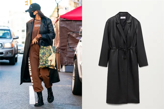 Irina Shayk deri görünümlü Mango trençkotuyla spor stilini bir araya getiriyor.