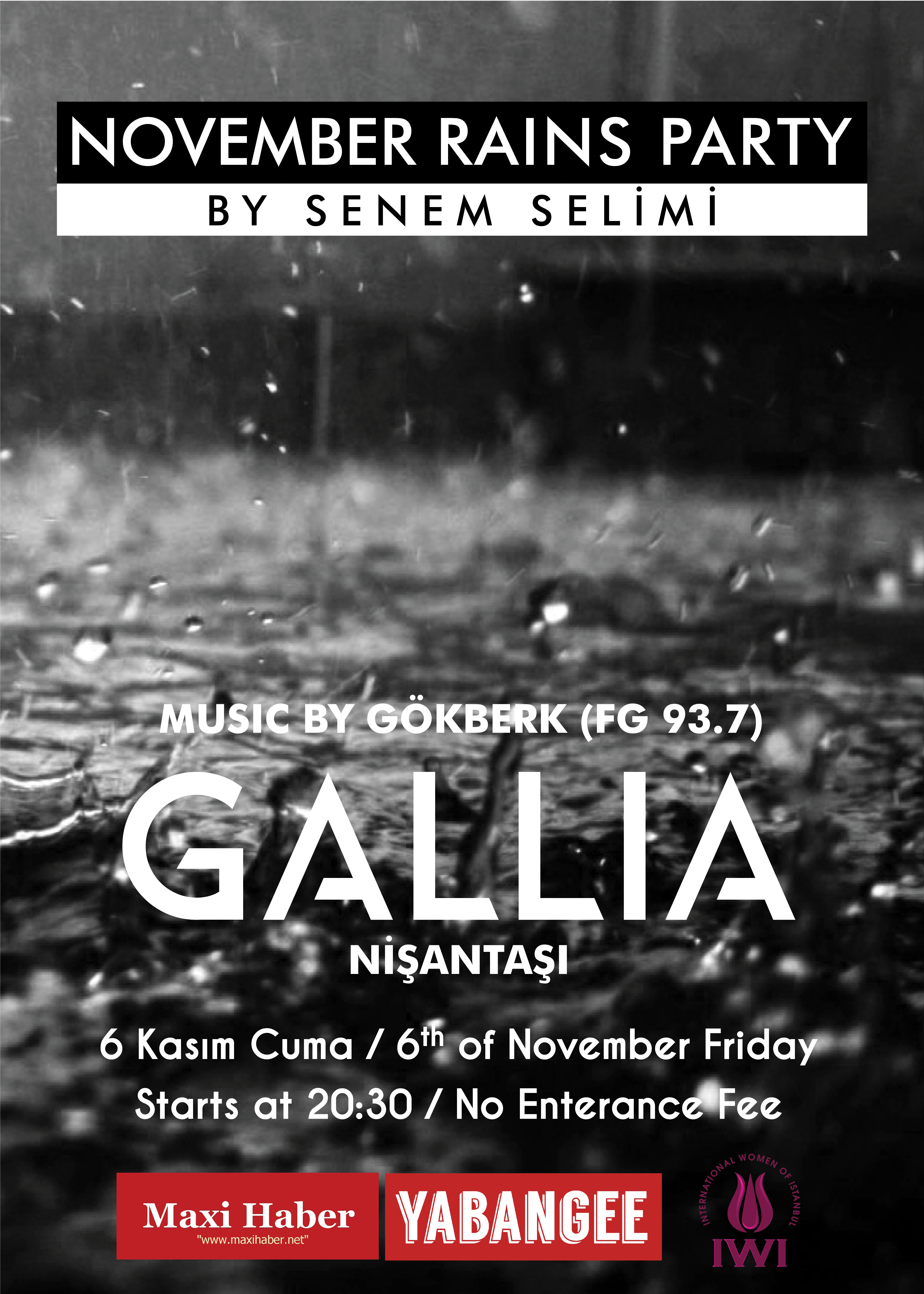 Kasım ayı yağmurlarına inat dostlarla beraber özel ve keyifli bir geceye dahil olup eğlenmek isteyenler, 6 Kasım 2015 Cuma akşamı Nişantaşı Gallia’da harika bir parti sizleri bekliyor.