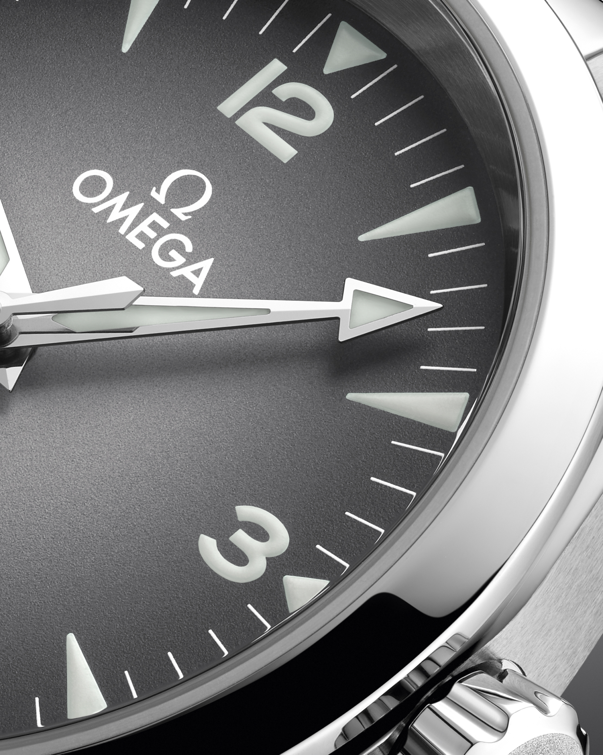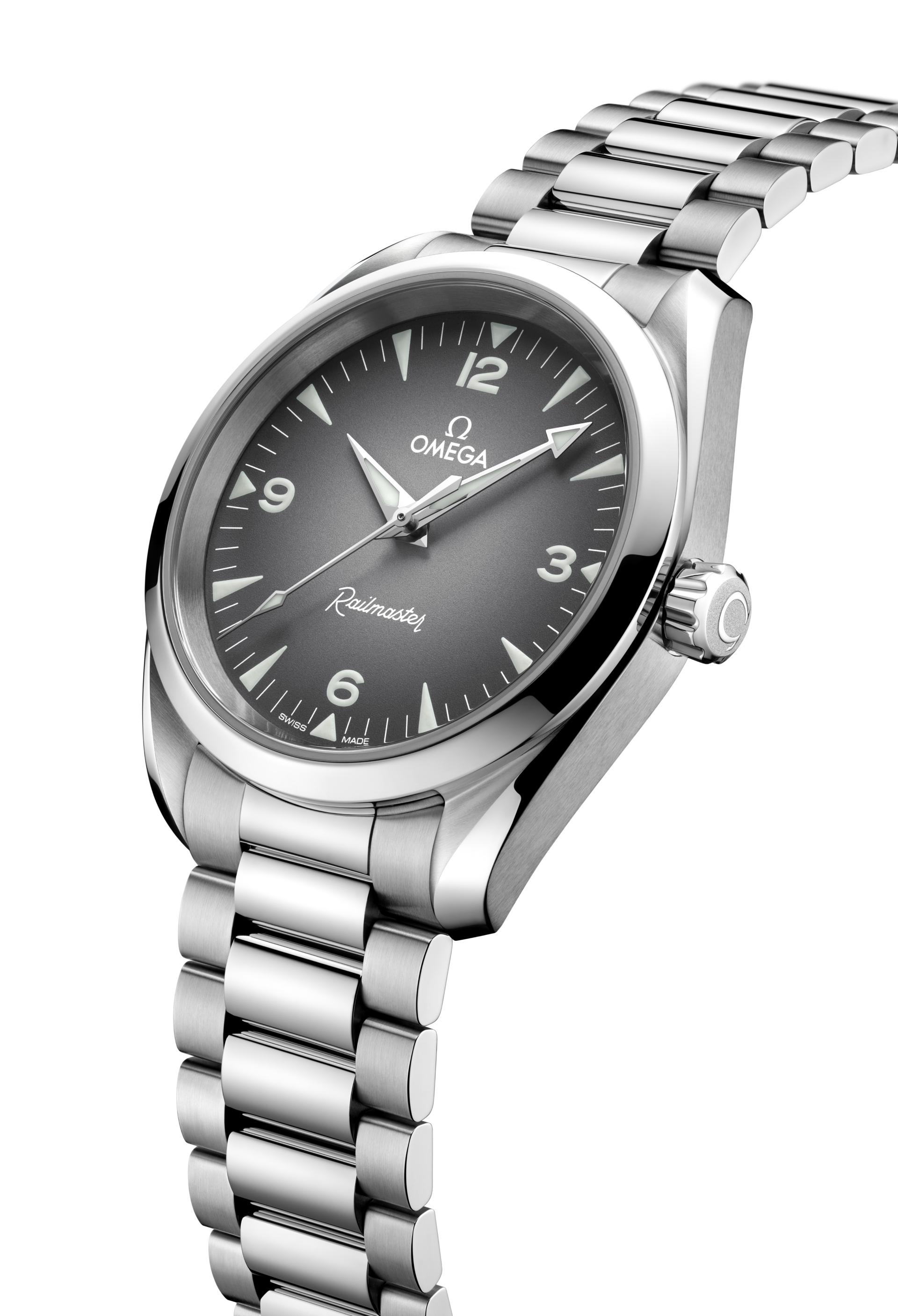 • Siyah gradyanlı gri kadrana sahip 38 milimetrelik model. Minimalist orijinal modele uyum sağlayacak şekilde, kadranda OMEGA logosu ve Railmaster adı haricinde yazı kullanılmıyor. Büyük saat indeksleri ve rakamlara beyaz Super-LumiNova uygulanarak, günün her saatinde mükemmel okunabilirlik sağlanıyor. Bu model, siyah deri kayış veya yeniden tasarlanmış parçalar, iyileştirilmiş entegrasyon ve kolay ayarlanabilirlik özelliğine sahip paslanmaz çelik bilezik ile sunuluyor.