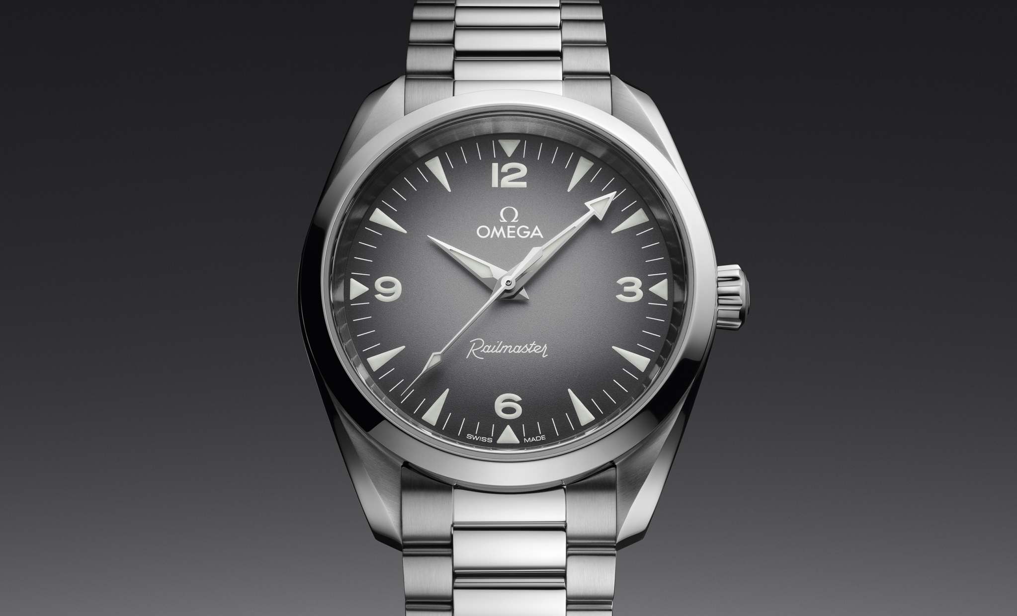 • Siyah gradyanlı gri kadrana sahip 38 milimetrelik model. Minimalist orijinal modele uyum sağlayacak şekilde, kadranda OMEGA logosu ve Railmaster adı haricinde yazı kullanılmıyor. Büyük saat indeksleri ve rakamlara beyaz Super-LumiNova uygulanarak, günün her saatinde mükemmel okunabilirlik sağlanıyor. Bu model, siyah deri kayış veya yeniden tasarlanmış parçalar, iyileştirilmiş entegrasyon ve kolay ayarlanabilirlik özelliğine sahip paslanmaz çelik bilezik ile sunuluyor.