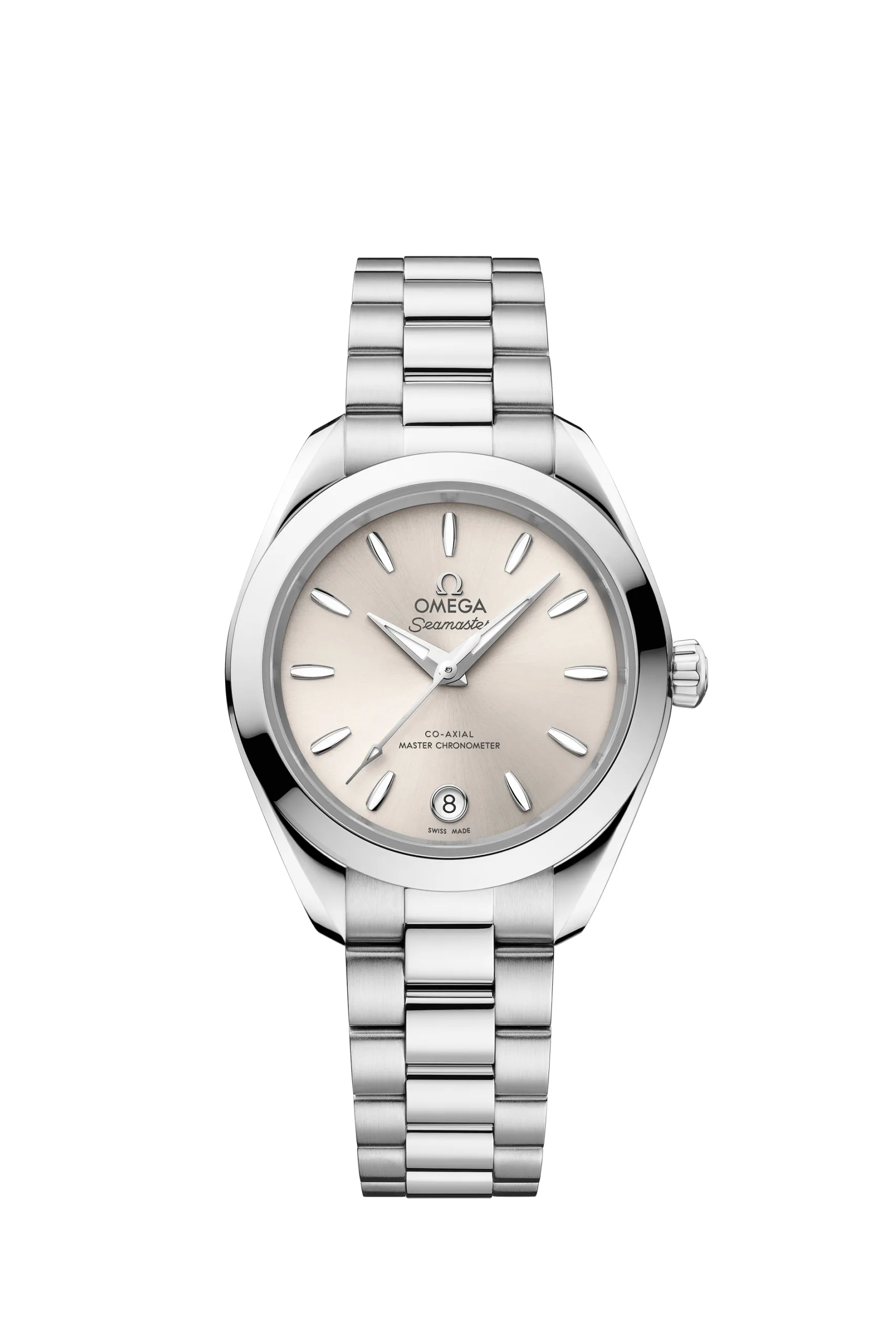 Entegre bilezik tasarımıyla Aqua Terra 30 mm koleksiyonu, paslanmaz çelik, çift tonlu paslanmaz çelik ve fırçalanmış ve parlatılmış altın bilezik seçenekleriyle sunuluyor. Entegre bilezik tasarımında OMEGA’nın patentli vida ve pim sistemi kullanılıyor. Kelebek toka ve kapakta yer alan butonlarla tamamlanan bu yapı, konfor ayarı sayesinde bilekte kişiselleştirilmiş ve zahmetsiz bir uyum sağlıyor.