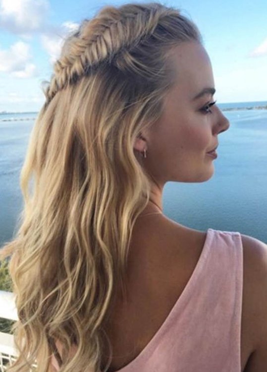 Margot Robbie’in yarım toplanan saçındaki balık kuyruğu örgüsü, bize büyük bir tatil havası veriyor. Modern gelinler için de oldukça ideal.