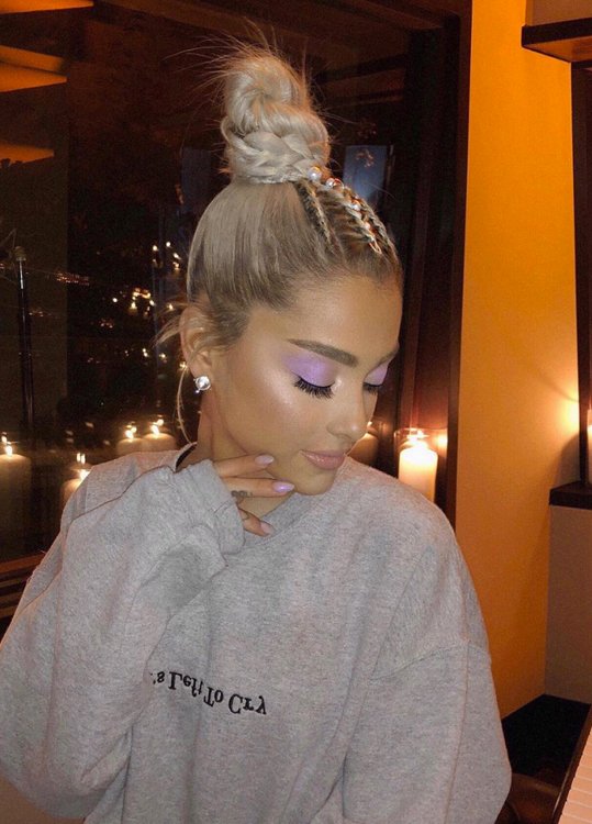 Ünlü şarkıcının saç stilisti Chris Appleton, yıldızın bu görünümü için saçın önünden başlayan mini örgüleri inci ile süslemeyi tercih ediyor ve kalın bir topuzla da son altın vuruşu gerçekleştiriyor. Mor renk göz farı ise bu eşleşmenin başrol oyuncusu olmayı başarıyor.