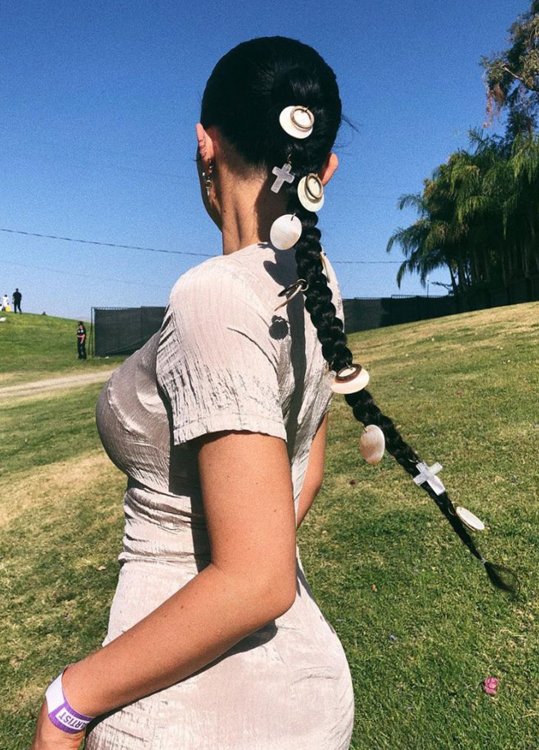 Yazın katılacağınız bir müzik festivali için ilham kaynağı olarak görebileceğiniz bu model bizim de favorilerimiz arasında. Kylie Jenner’ın deniz kabukları ve çeşitli aksesuarlarla hareketlendirdiği at kuyruğu örgüsü için saç stilisti, yumuşak ancak sıkı tutuş sağlayan bir yüzey için Hindistan Cevizi Yağı Jeli kullandığını belirtiyor.