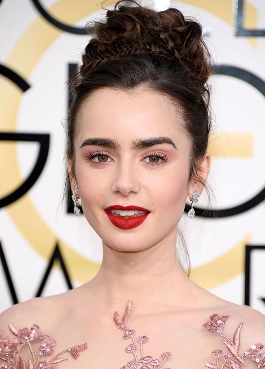 Lily Collins’in örgü ayrıntılarıyla hareketlenen kabarık saç topuzunun karışık gibi görünen ama ideal bütünlüğü yakalamayı başaran bu zarafeti favorilerimizden.