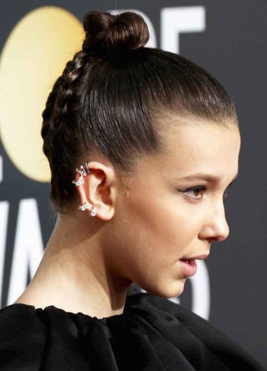 Stranger Things dizisinin 13 yaşındaki oyuncusu, 2018 Altın Küre Ödül Töreni’nde basit üst topuzunu, arkadan devam eden üç Fransız örgüsüyle tamamlamayı tercih etmişti.