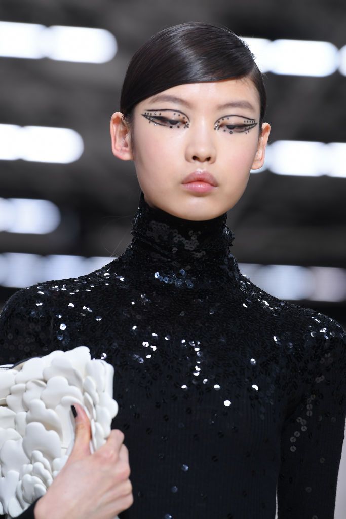 Valentino’nun ikonik kırmızı bu sezon siyaha dönüştü. Derinden ayrılarak toplanan saçlar; Pat McGrath’ın gözlerde negatif alan bırakarak yerleştirdiği siyah taşlarla gizemli bir görünüm yarattı.