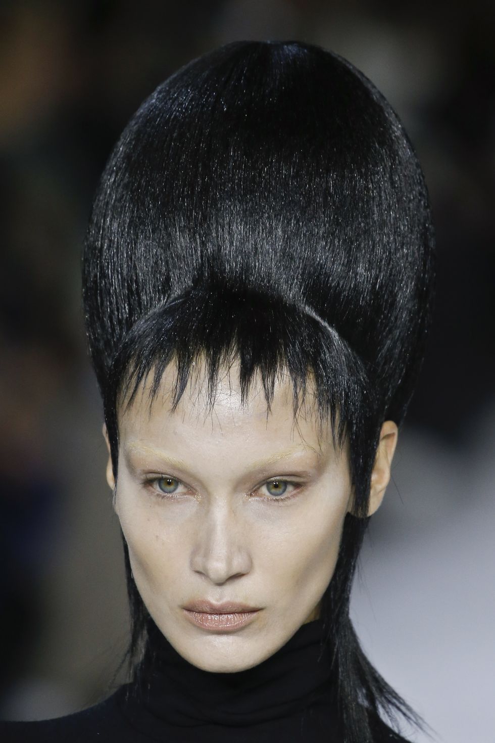 Yerçekimine karşı koyan beyazlatılmış kaşlar ve saç artisti Duffy’nin yarattığı “süper yüksek kahküllü yaratık topuzları”; bembeyaz ten makyajıyla birlikte “alien” estetiği sunuyordu. Bella Hadid’in bu görünümünün Paris Moda Haftası’nın en akılda kalan anlarından biri olduğunun da altını çizelim.