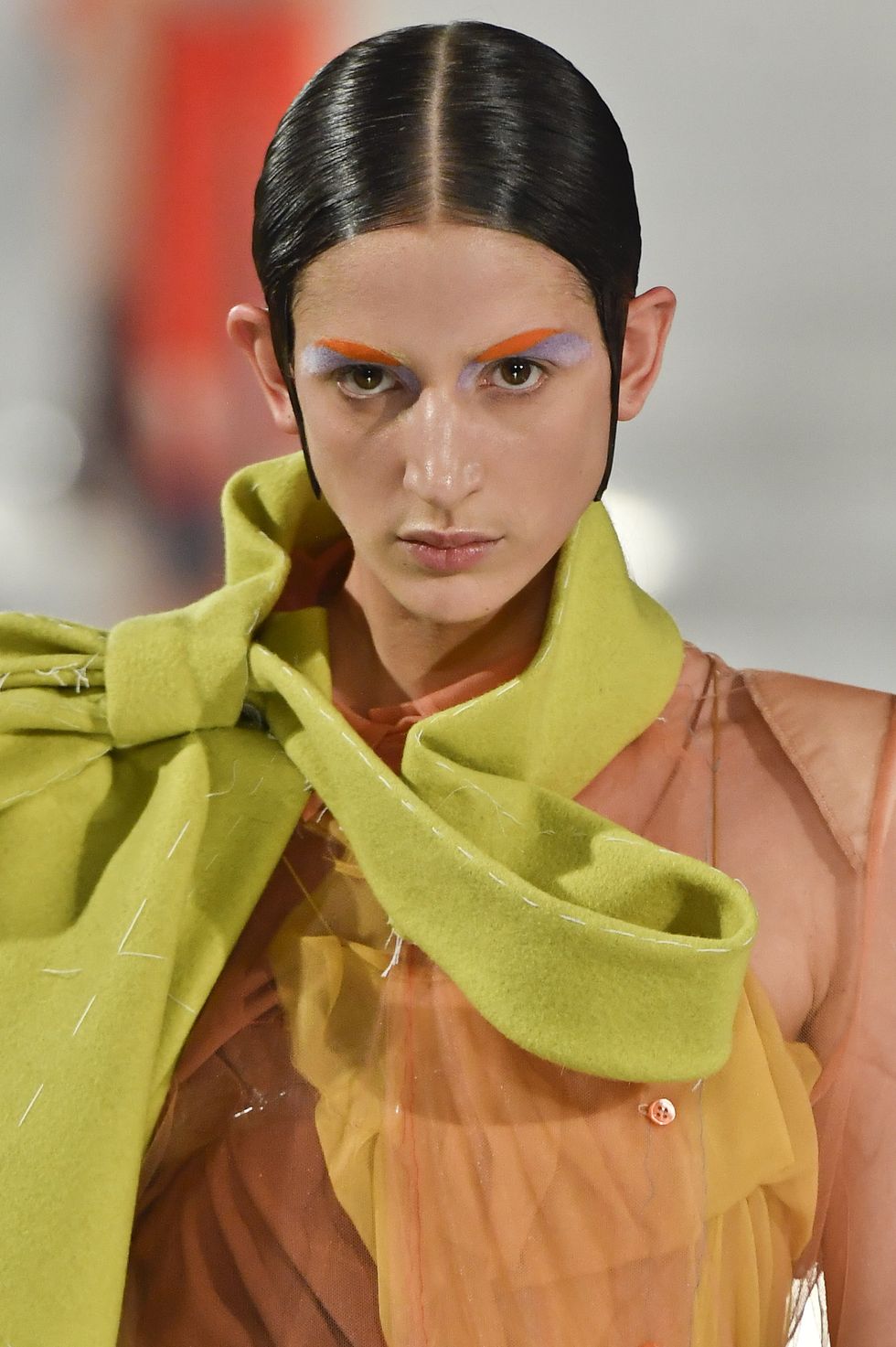Maison Margiela podyumunda “artsy” modunda; grafik göz makyajlı modellerin geçişini izledik. Pat McGrath’ın yarattığı bu göz makyajını; ıslak ten makyajı ve nude dudaklar tamamlıyordu.