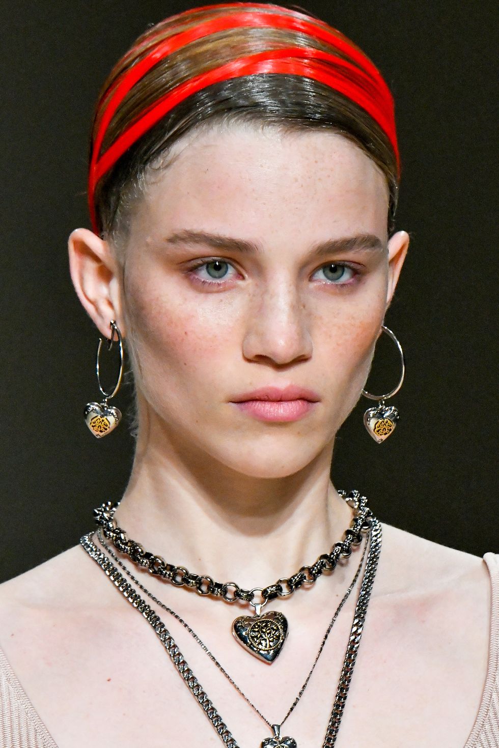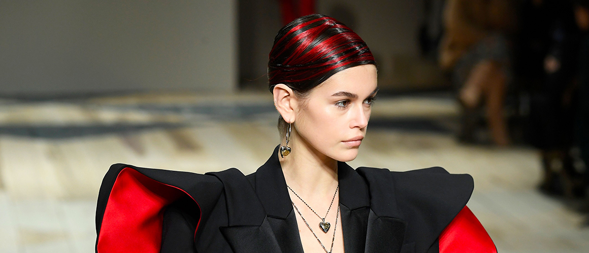 Alexander McQueen Sonbahar/Kış 2020 defilesi için Guido Palau’nun yarattığı kırmızı röfleli toplu saç ve deri kombinlerin birlikteliği; bizi gotik aşk hikayelerine sürükledi. Makyaj ise daha duru bırakılarak gizemli etki arttırılmıştı.