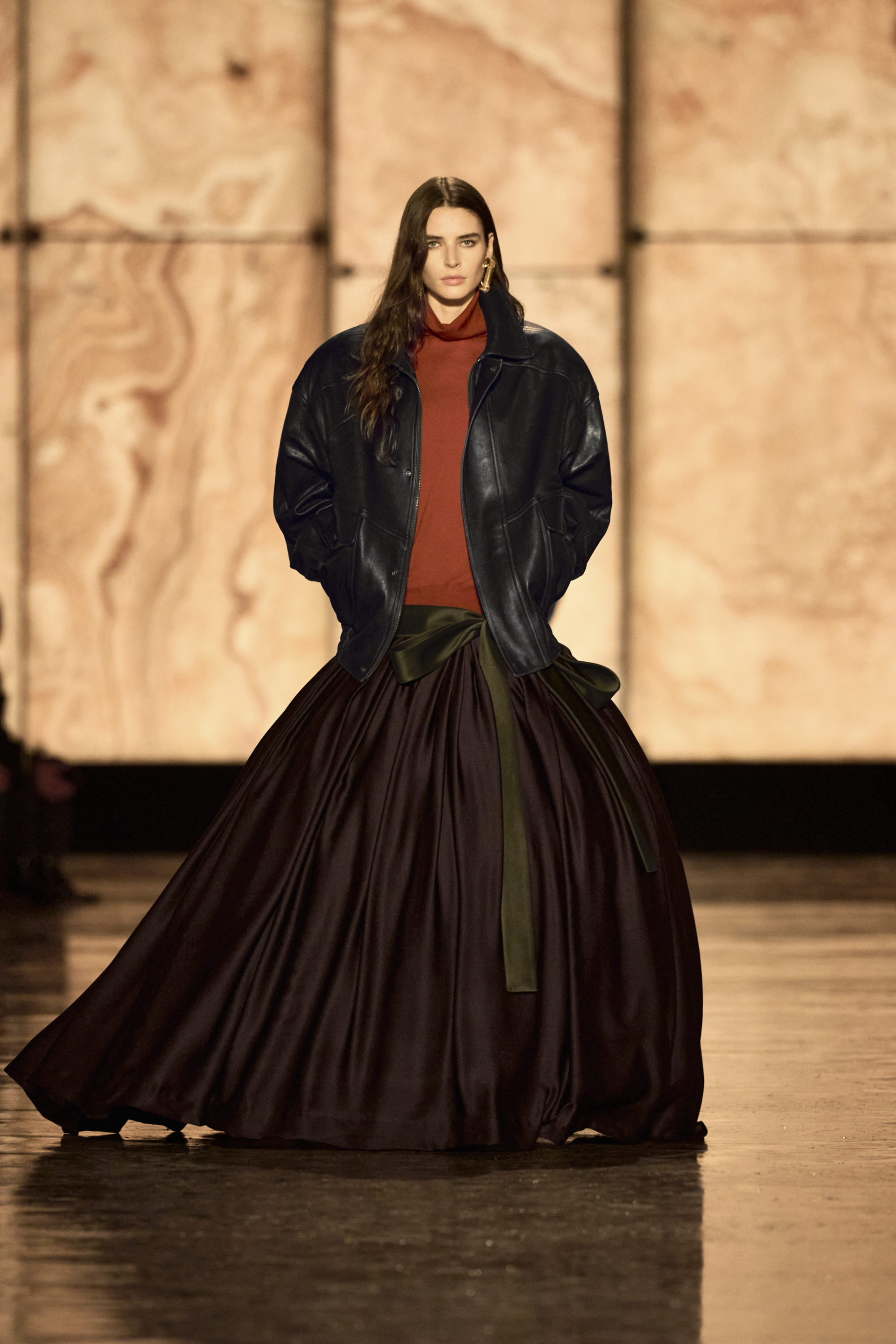 Derin yıkamalı geniş etekler, deri bluzonlarla kombinlenerek bir belirsizlik hissi yaratırken, koleksiyonun belirgin çizgileri, Saint Laurent’in imza renklerinin doygun tonlarıyla tamamlanıyor.