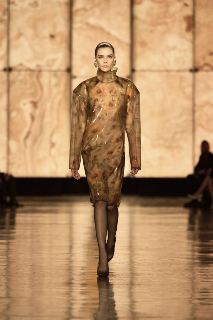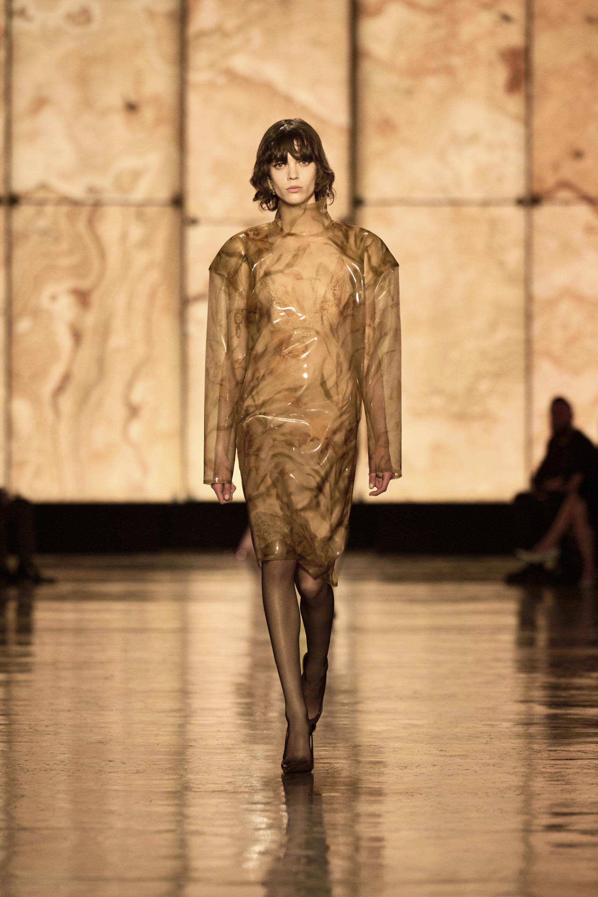 Koleksiyonun mineral dokusunu yansıtan devasa oniks oval şeklindeki set tasarımı, parlayan duvarlarıyla hem aşılmaz bir sertliği hem de henüz keşfedilmemiş derinlikleri çağrıştırıyor; zengin desenleri ise insan karmaşıklığının anlık bir yansıması gibi görünüyor.